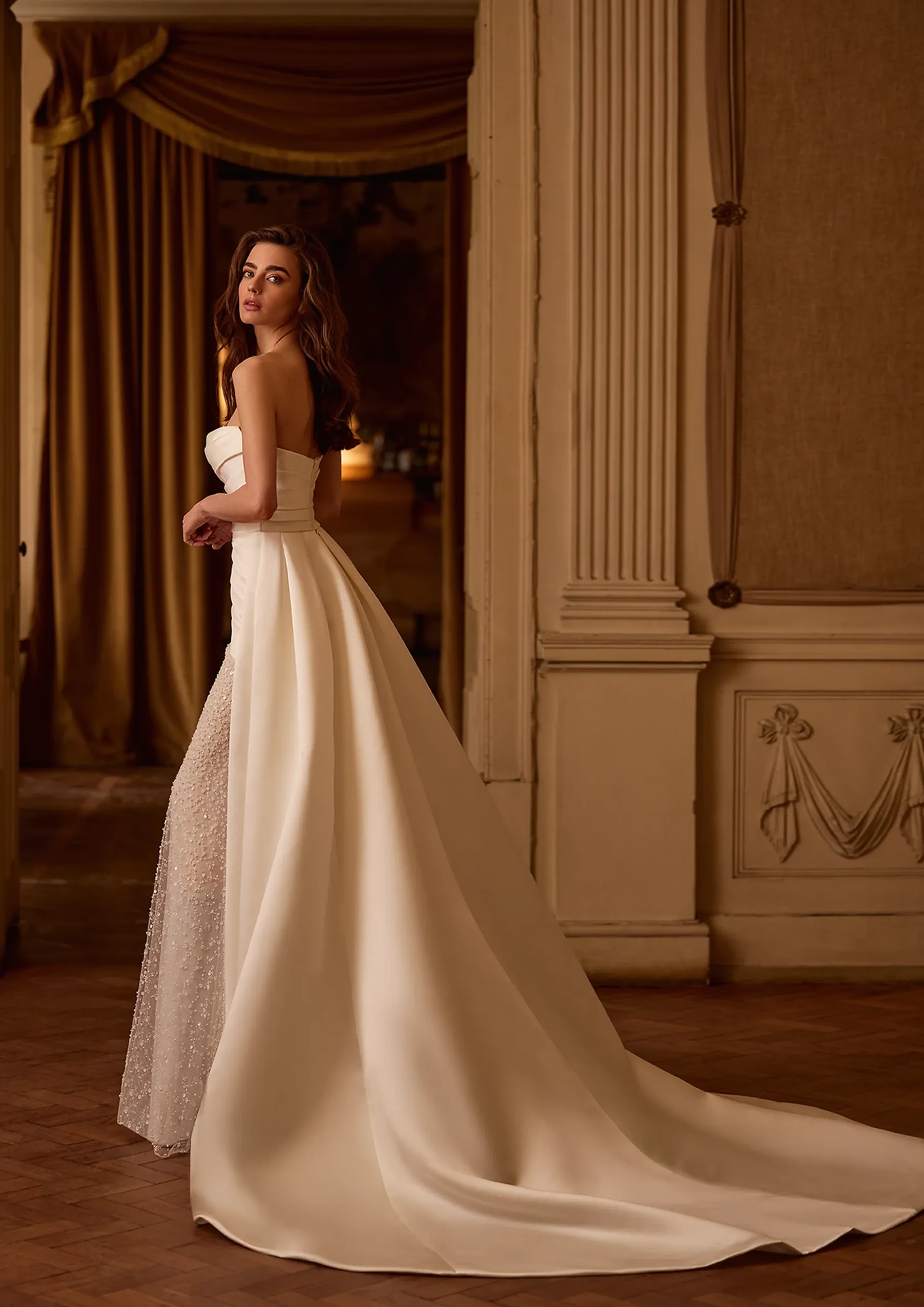 Robe de mariée sirène moderne, entièrement réalisée en perles. Elle est complétée par un corset drapé avec une surjupe en satin amovible, créant un effet double look.