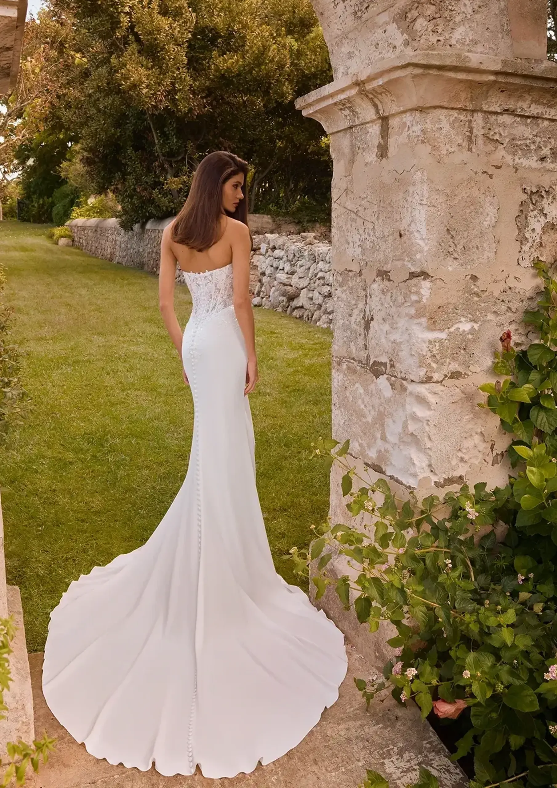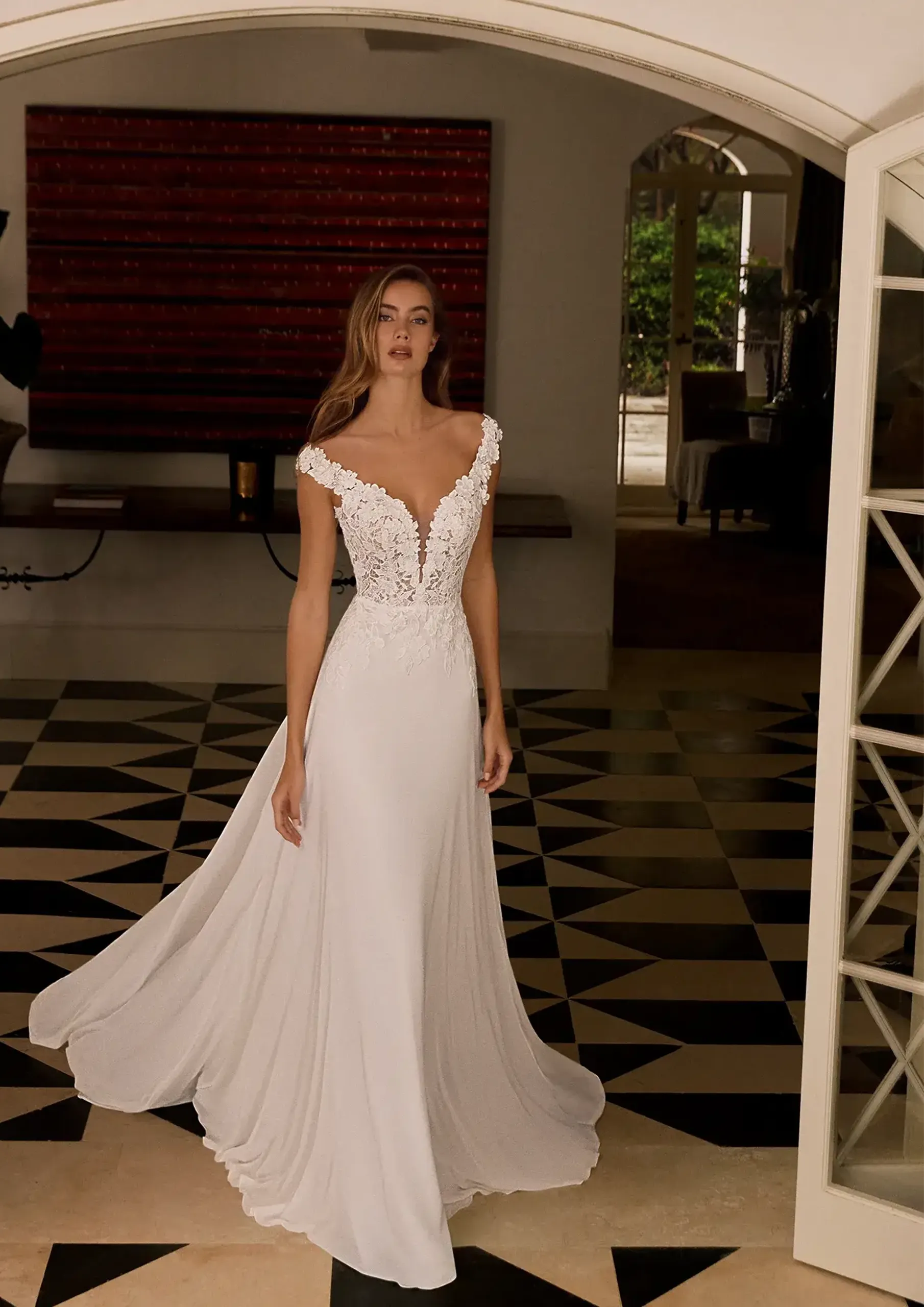 Robe de mariée de style moderne réalisée en dentelle et crêpe aux lignes épurées et au style résolument glamour. Corsage réalisé avec des applications de dentelle et découpes en relief.