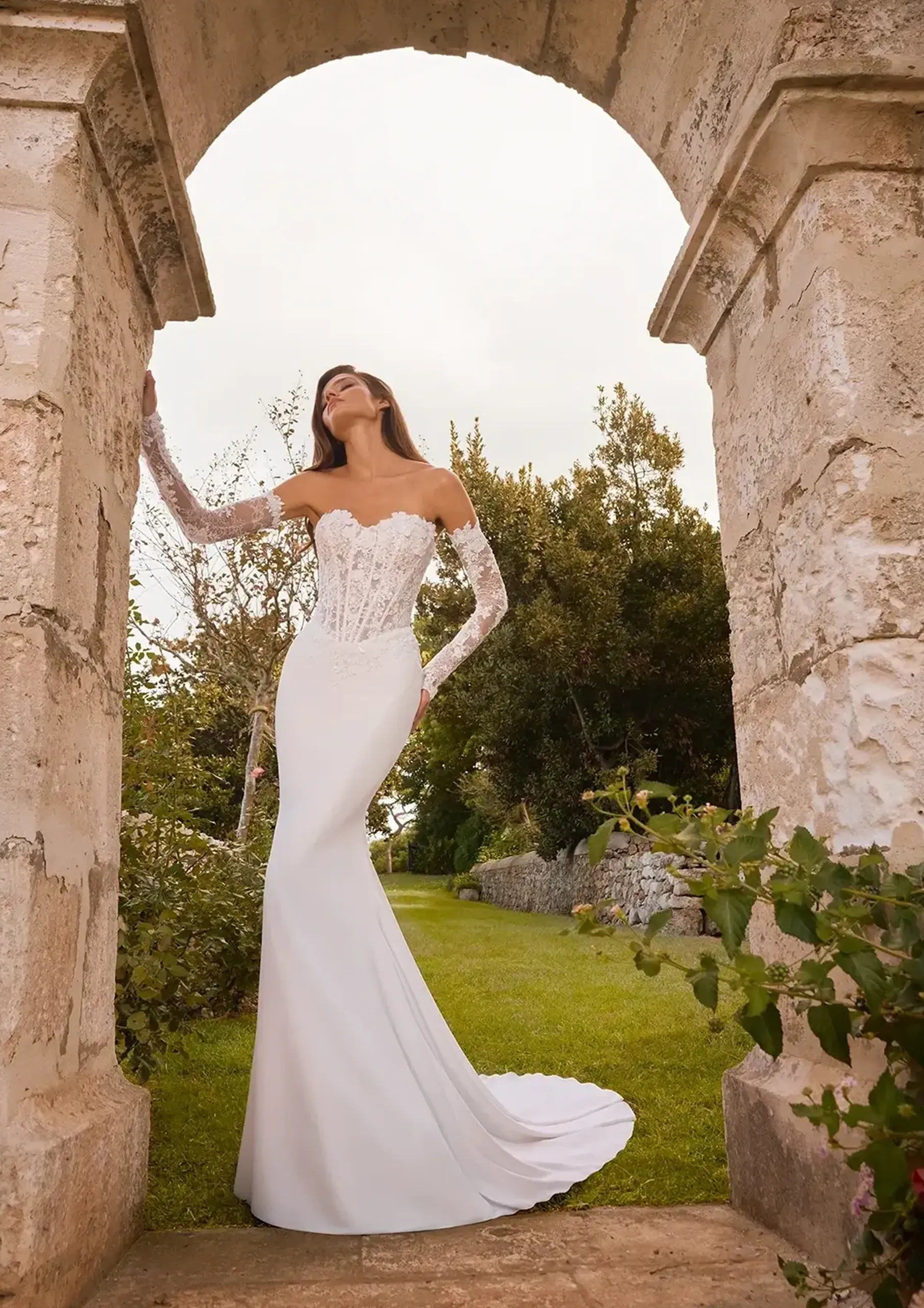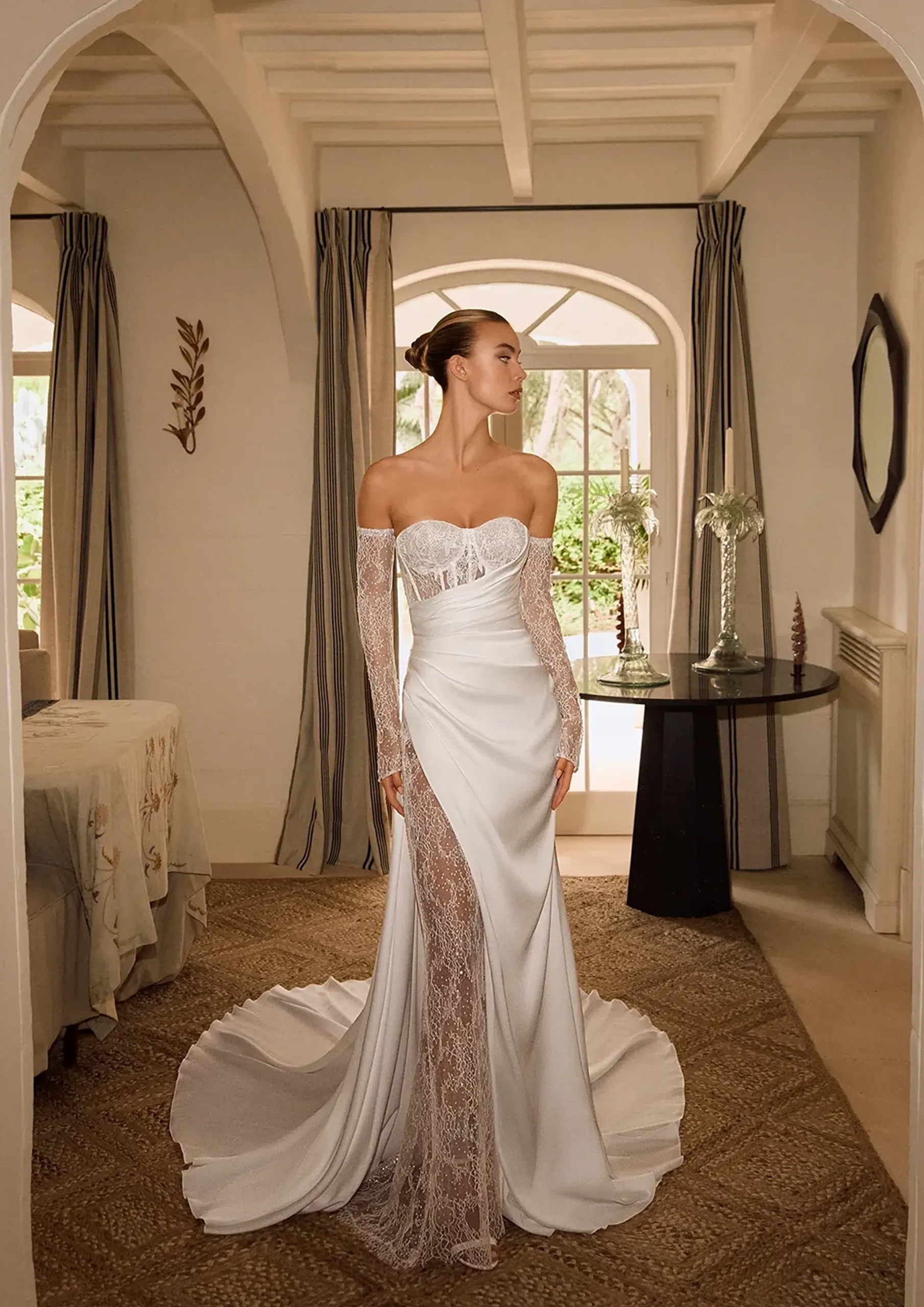 Robe sirène de style moderne qui combine un corsage corset en dentelle et une robe drapée en satin doux. Fente latérale en dentelle et manches longues amovibles.