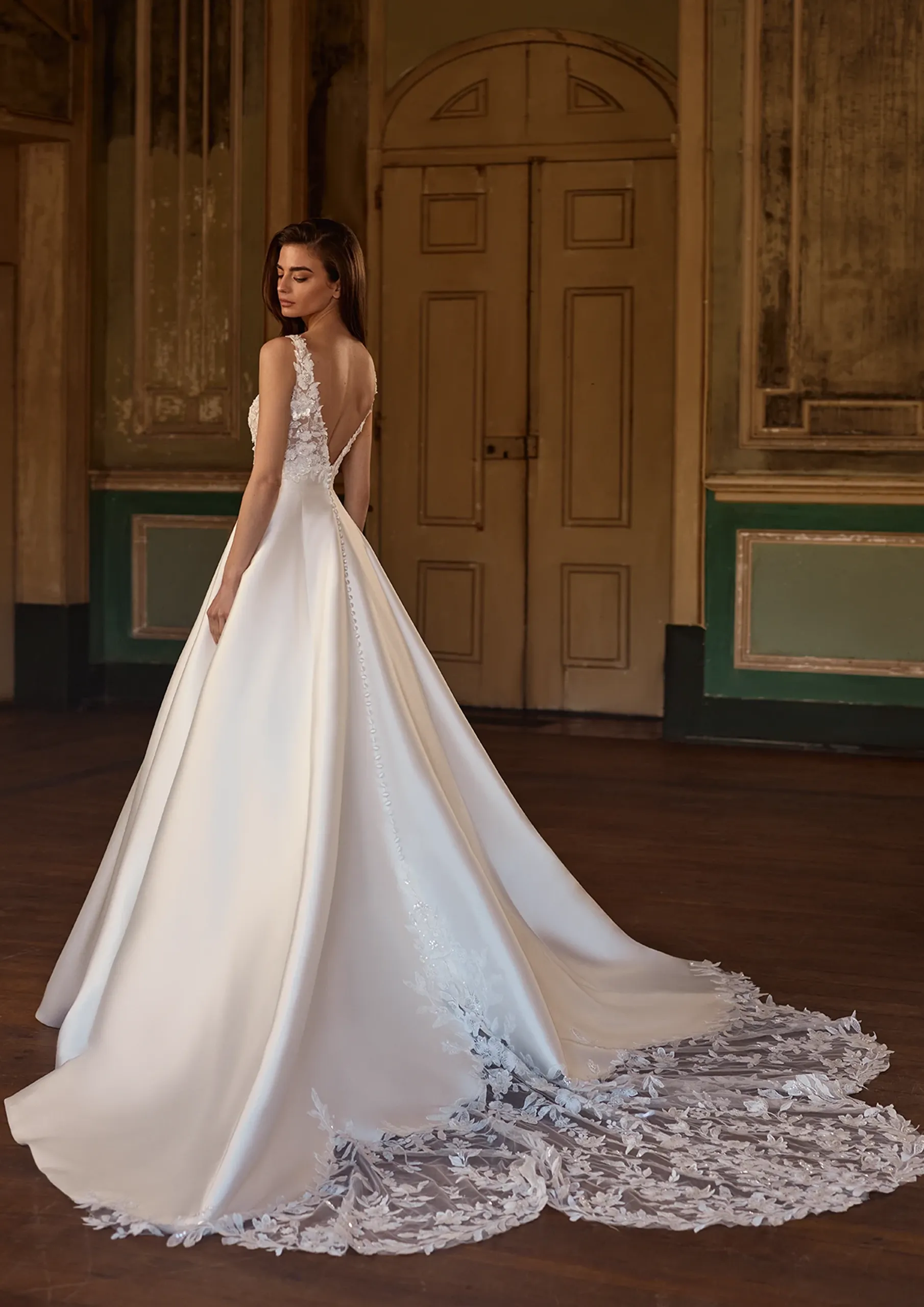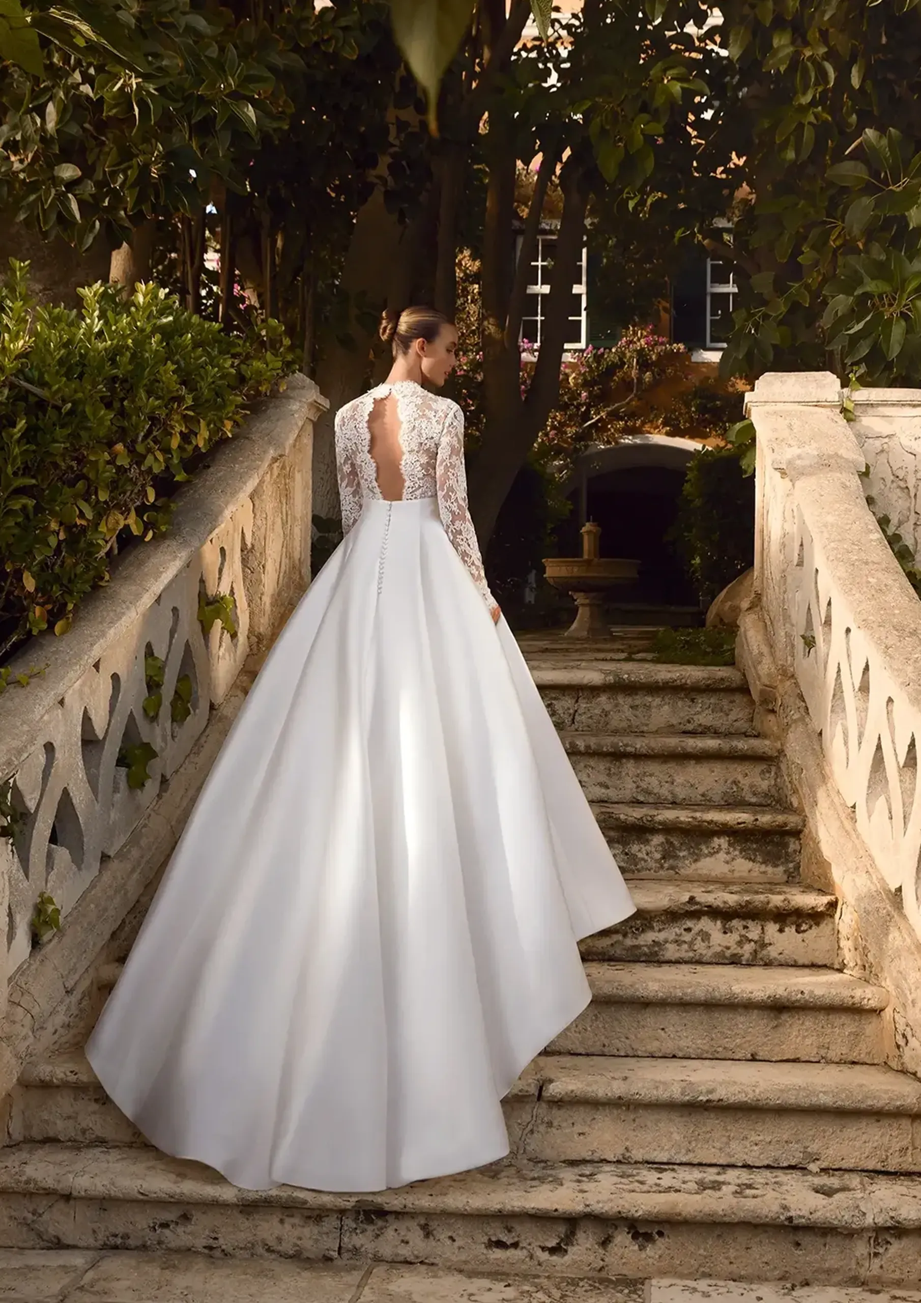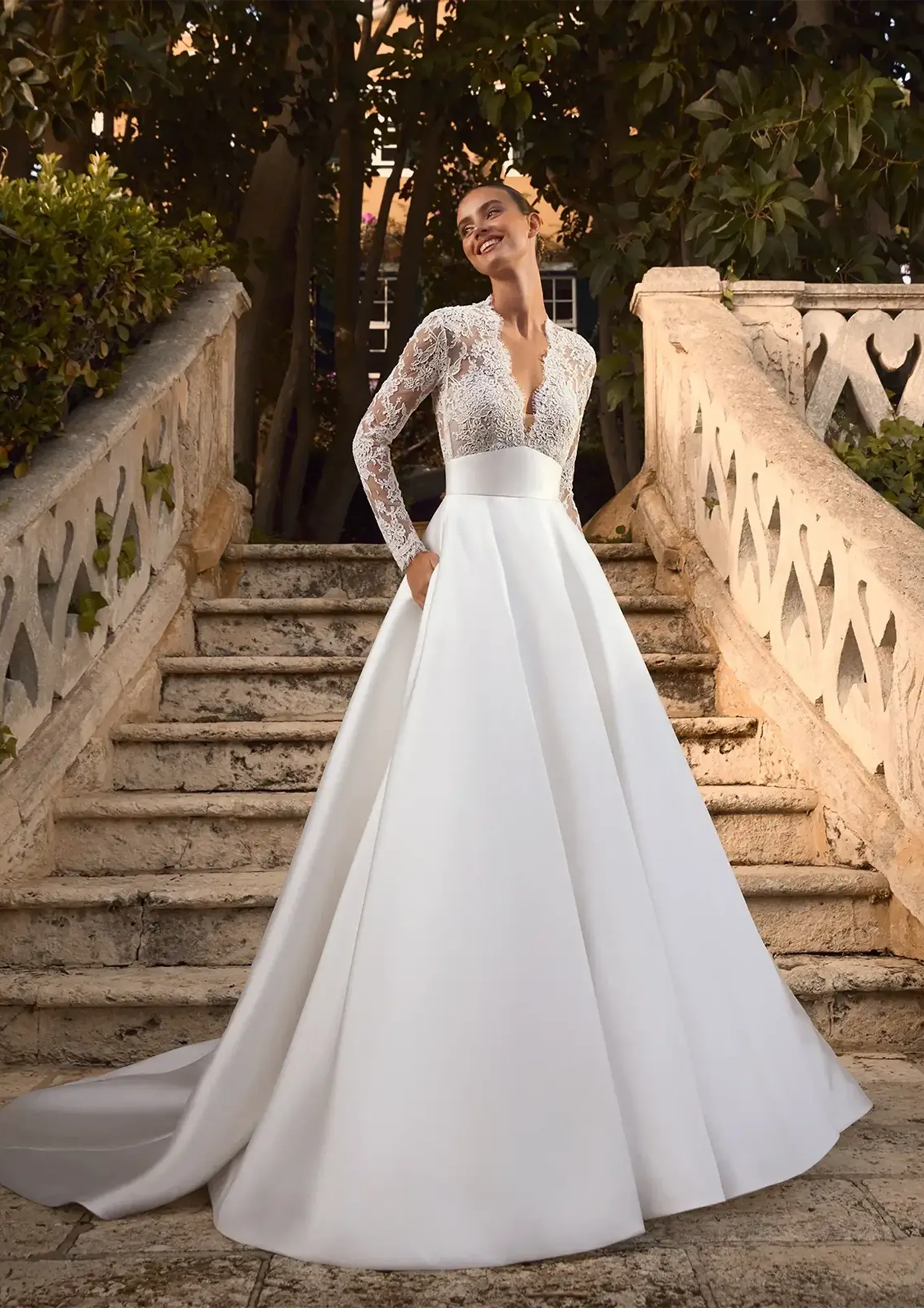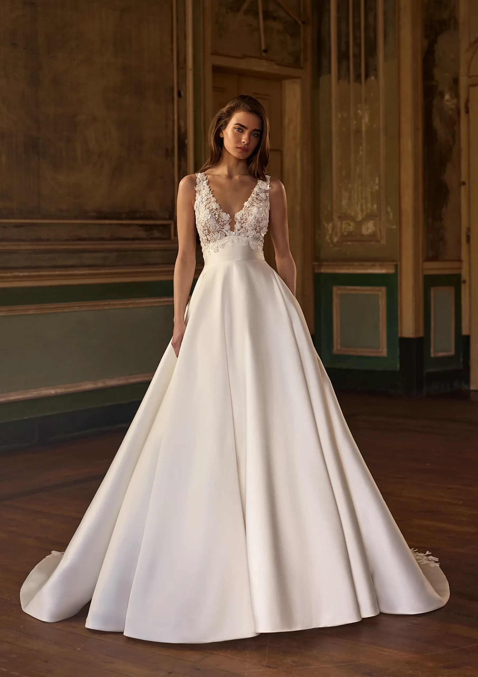 Robe de mariée princesse romantique, associant un corsage en délicates applications de dentelle et perles, un décolleté en V, et une jupe en mikado avec une petite traîne en dentelle.