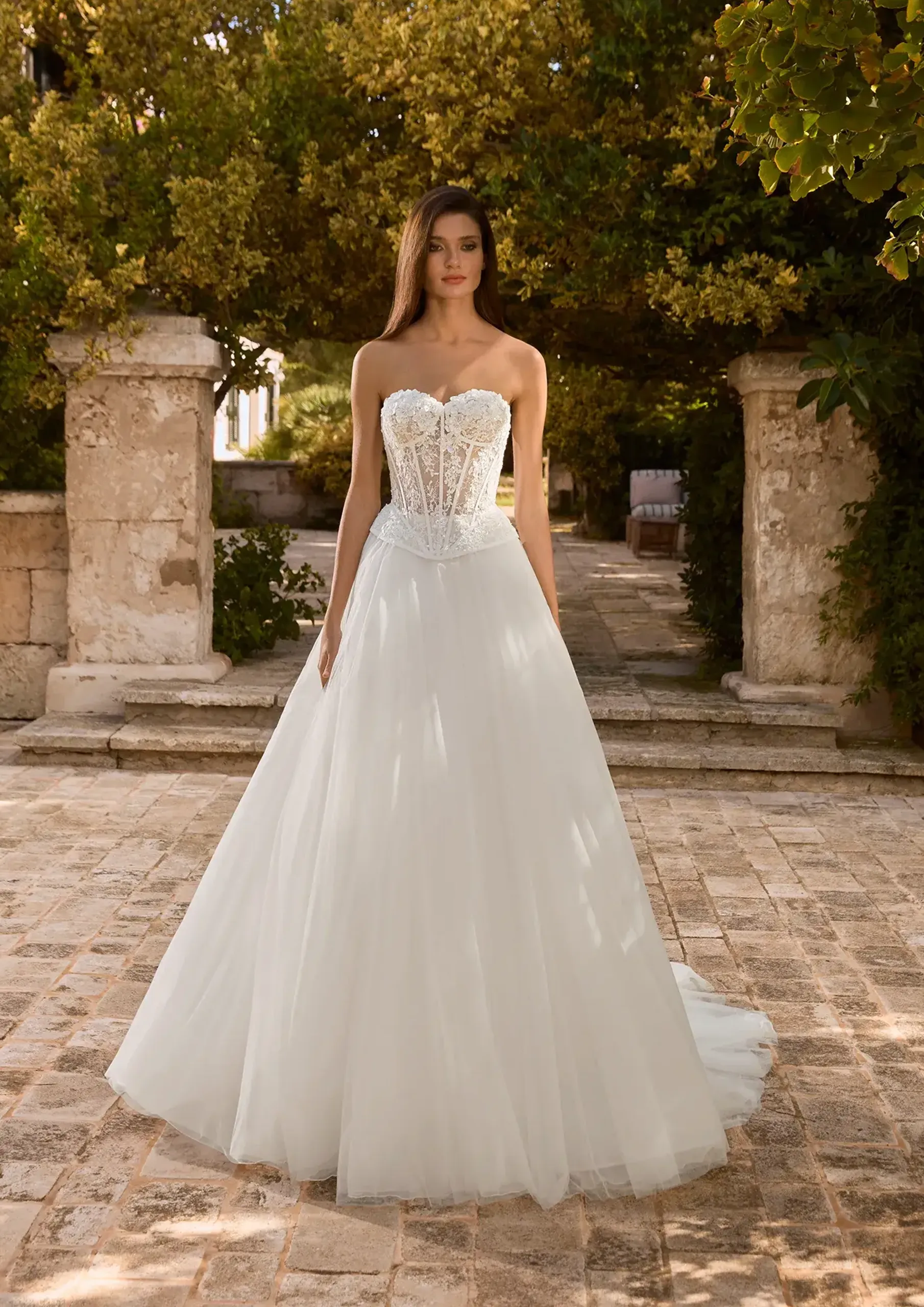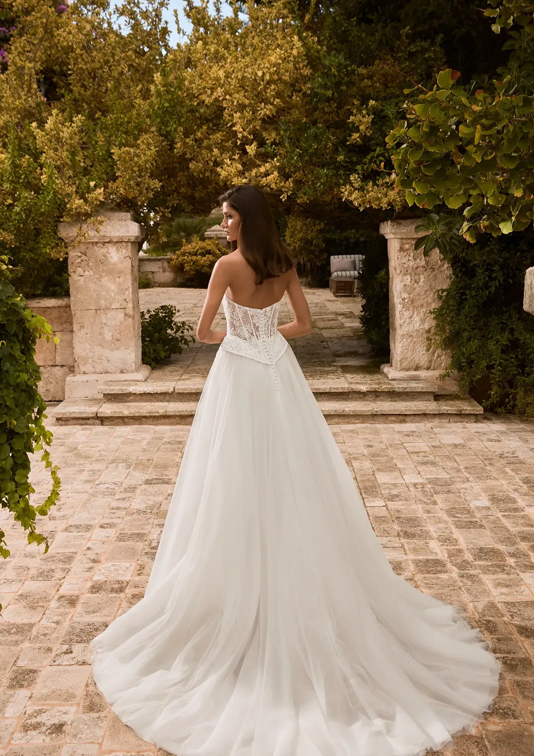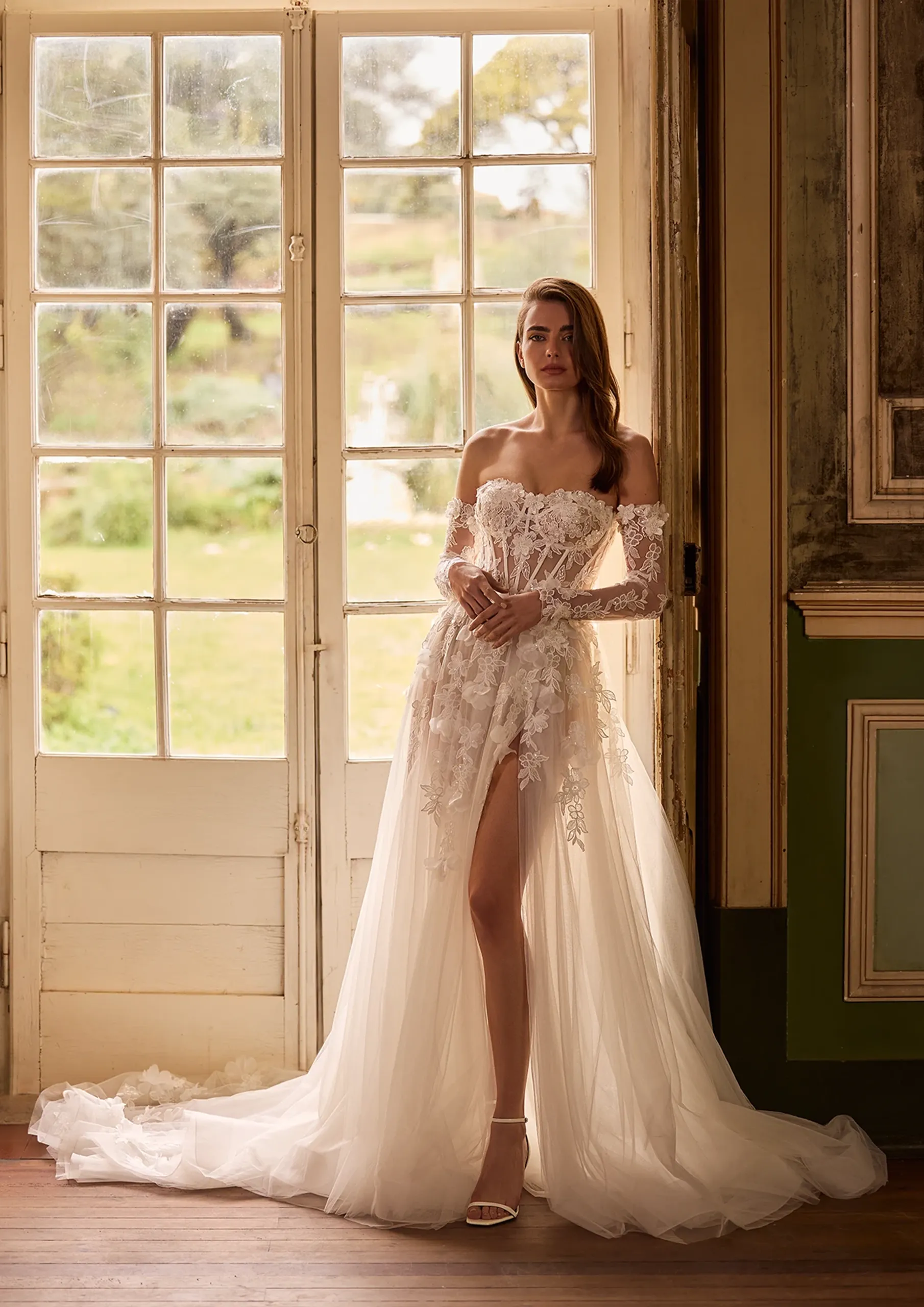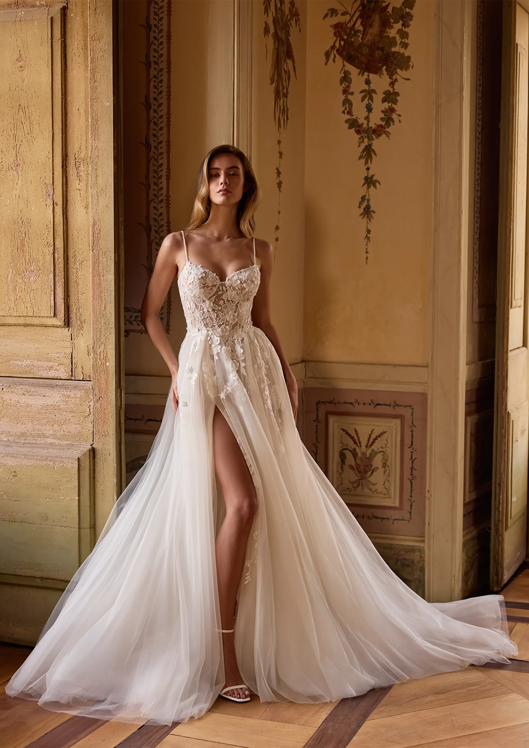 Robe de mariée coupe princesse romantique alliant un corset structuré orné de délicates applications de dentelle et de fleurs 3D, sur une jupe en tulle fendue sur la jambe.