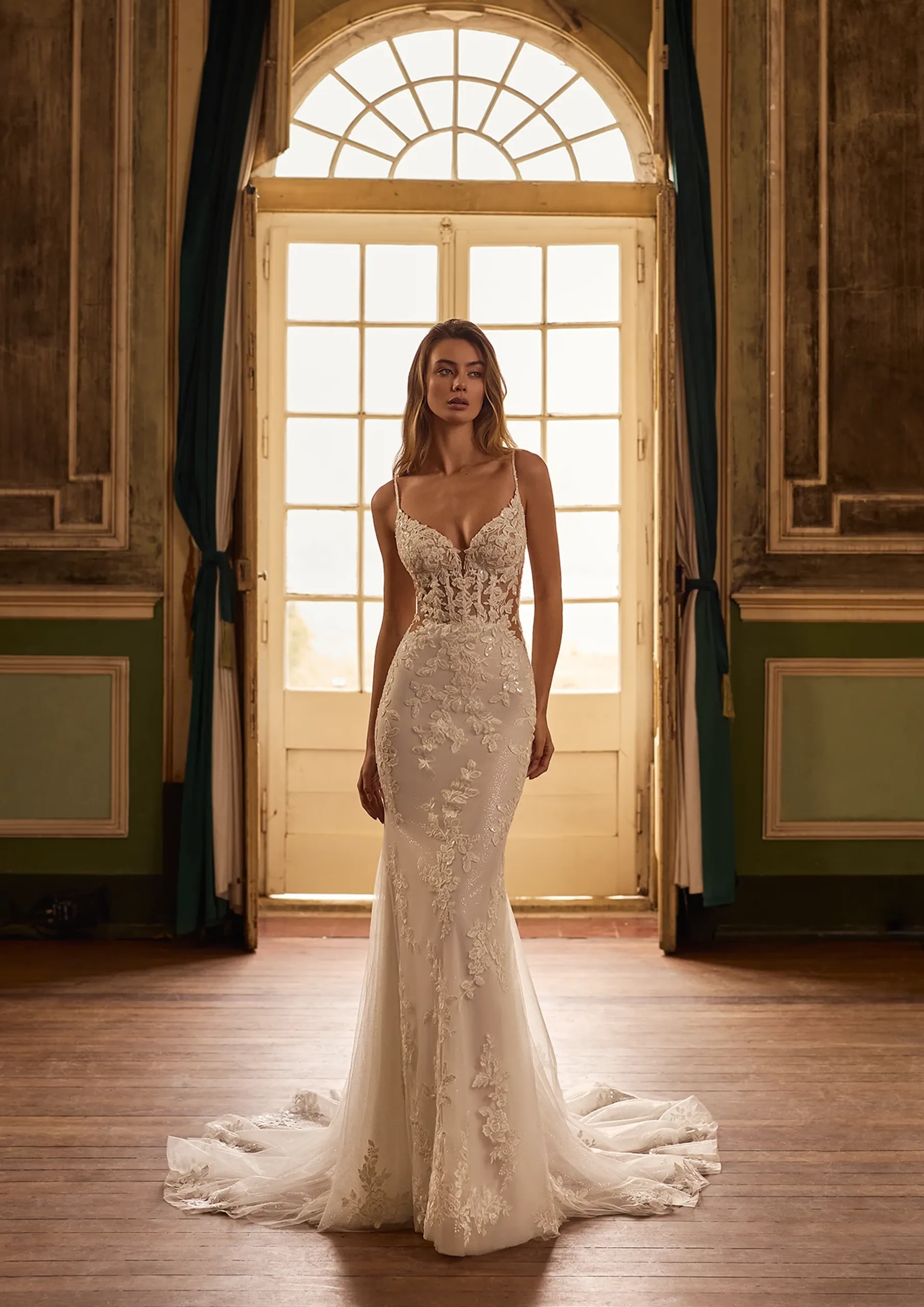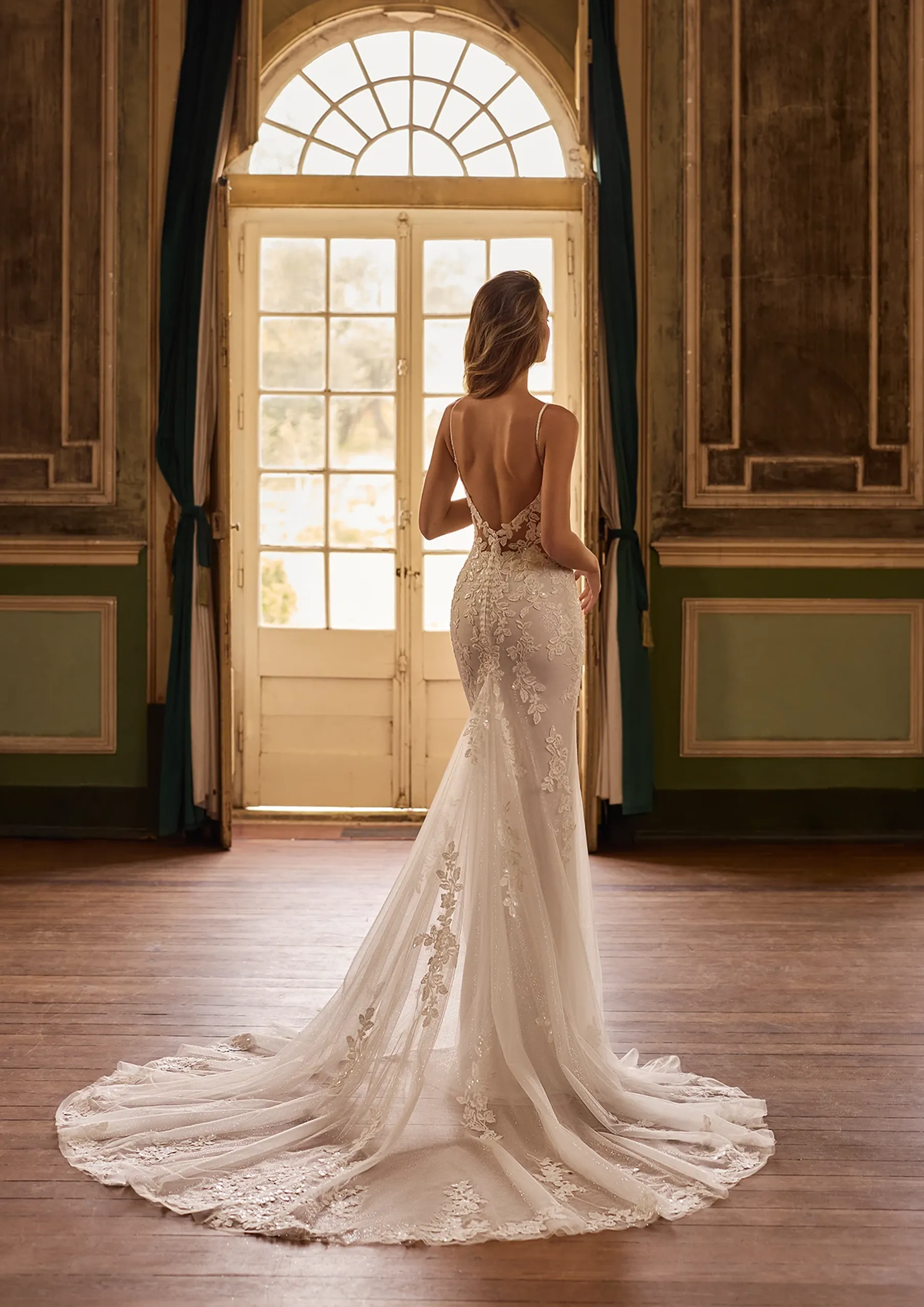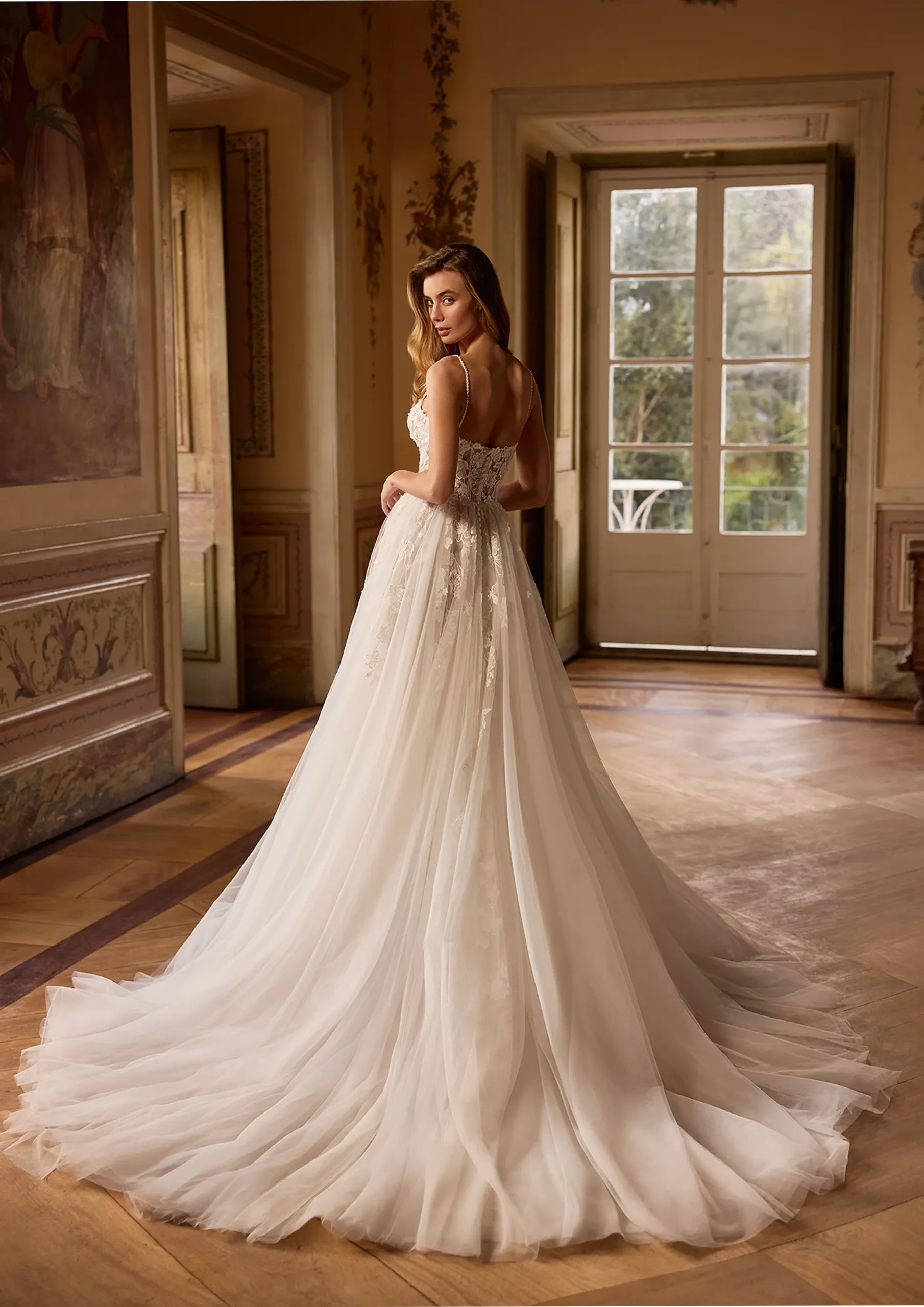 Cette splendide robe de mariée est faite avec des applications florales sur une base de tulle soyeux. Sa conception présente un corps ajusté avec un décolleté ouvert et arrière sur une jupe de volume moyen.