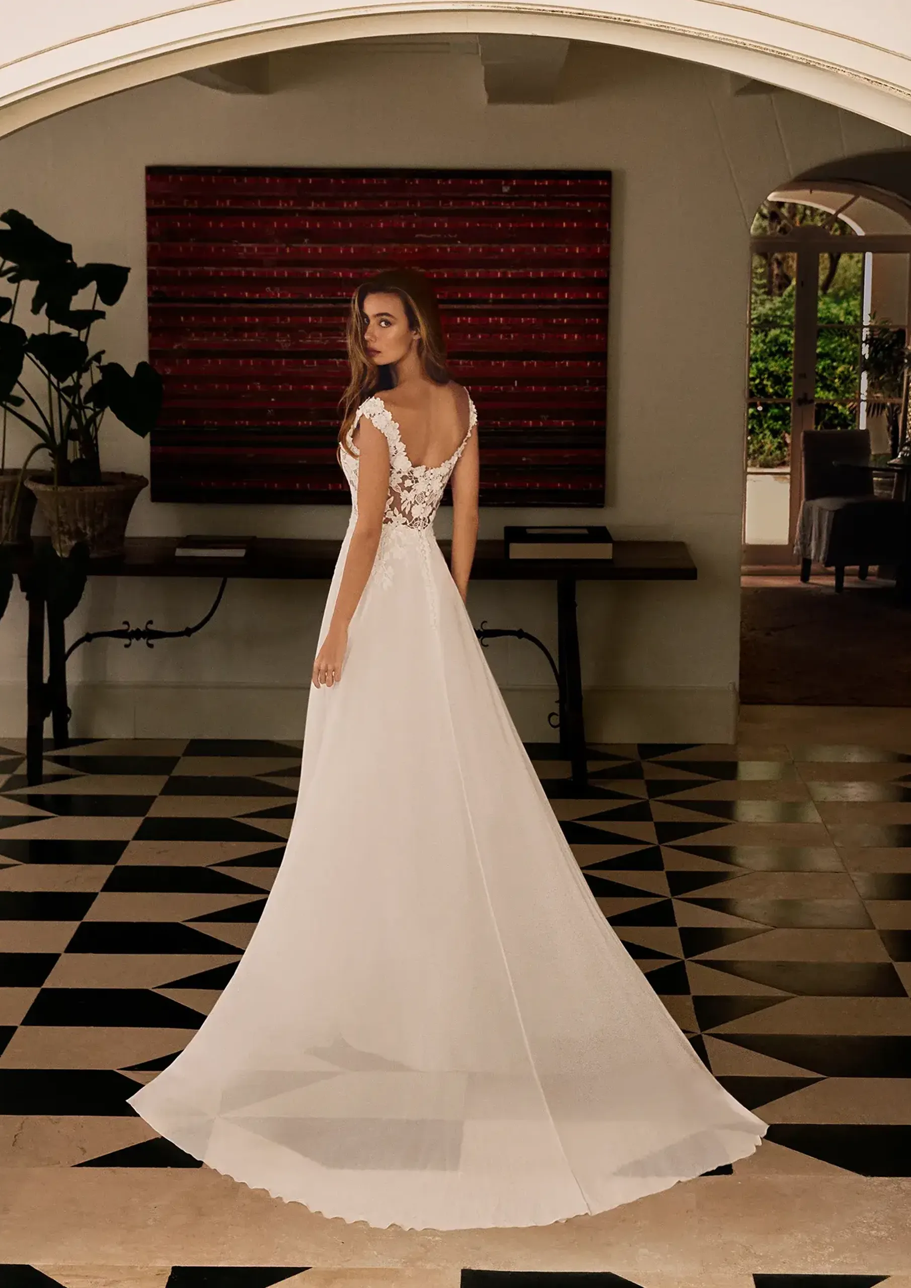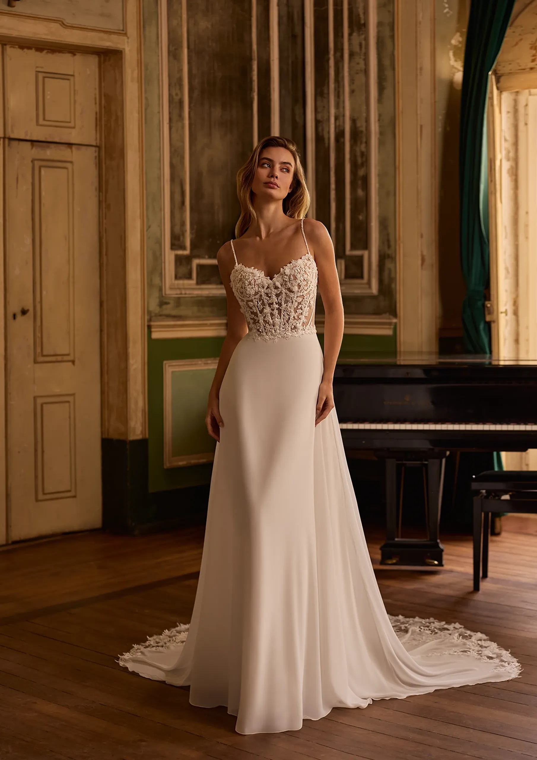 Robe de mariée romantique en ligne A, combinant un corsage à décolleté en V réalisé avec de délicates applications de dentelle et des fleurs 3D, sur une jupe en chiffon soyeux ornée d’applications de dentelle sur l’ourlet.