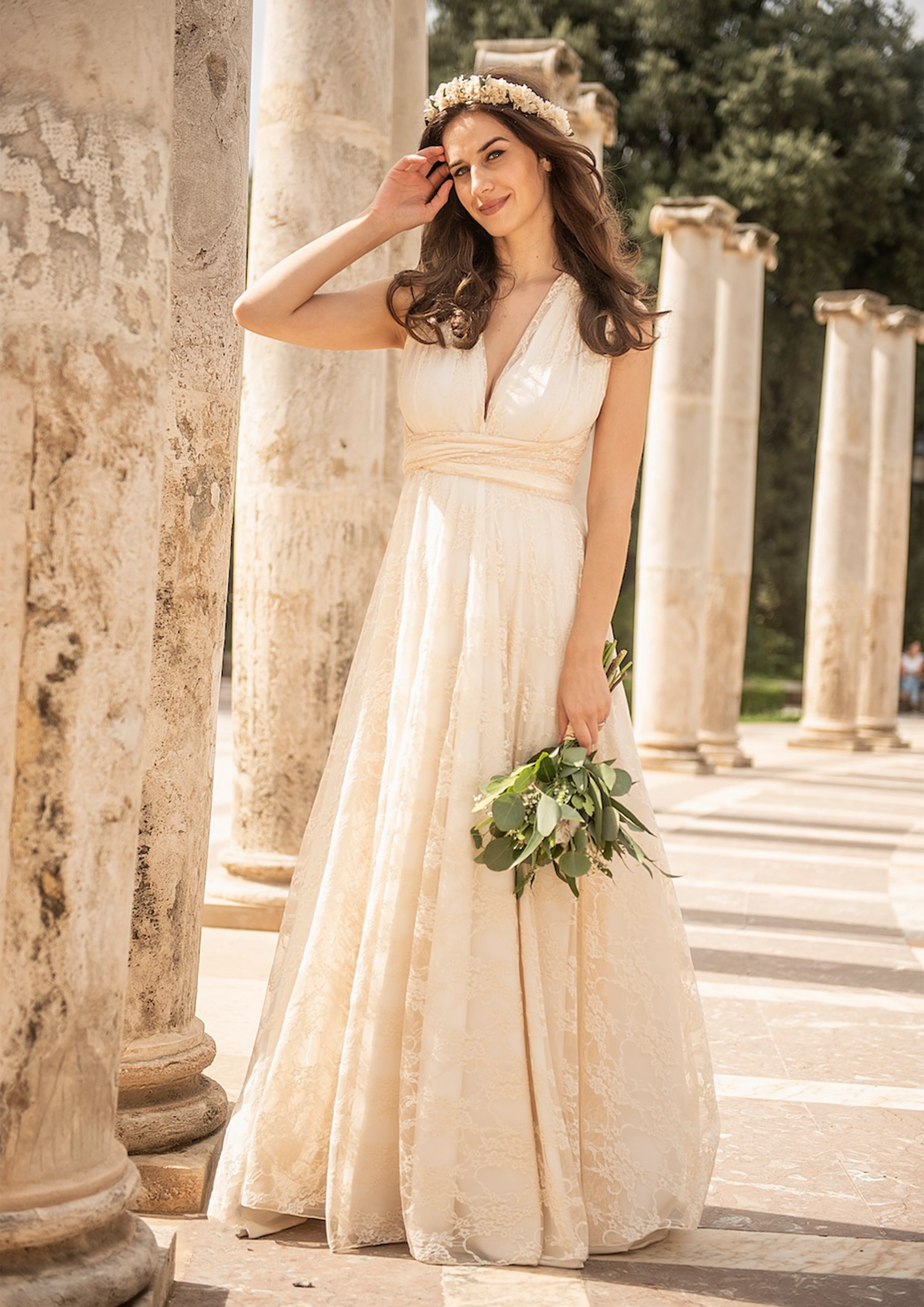 Cette robe de mariée élégante se distingue par un corsage au décolleté V réalisé en dentelle et d’une jupe en mousseline délicate. Viviana est une robe au look naturel et vibrant.