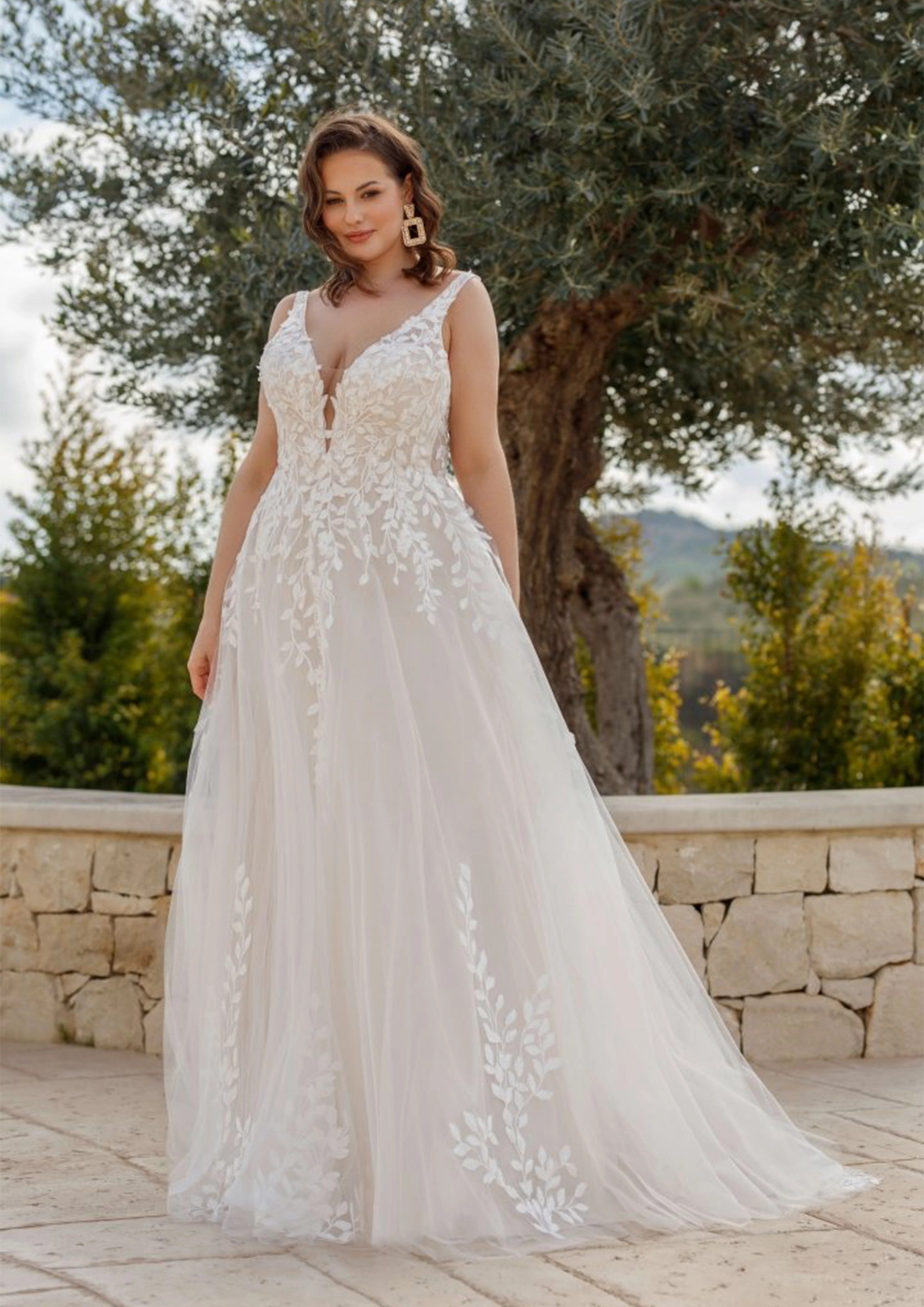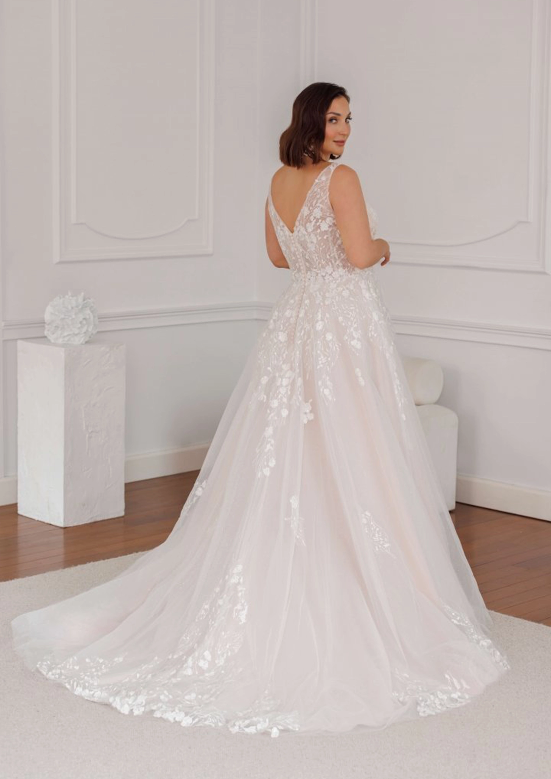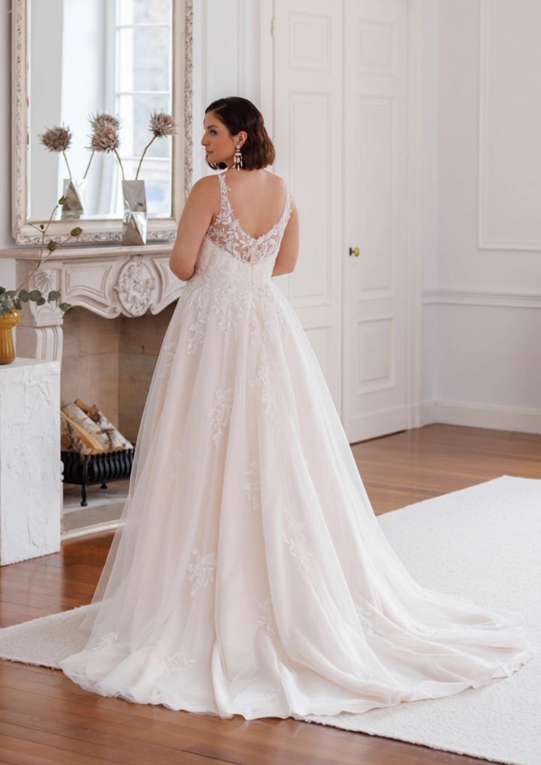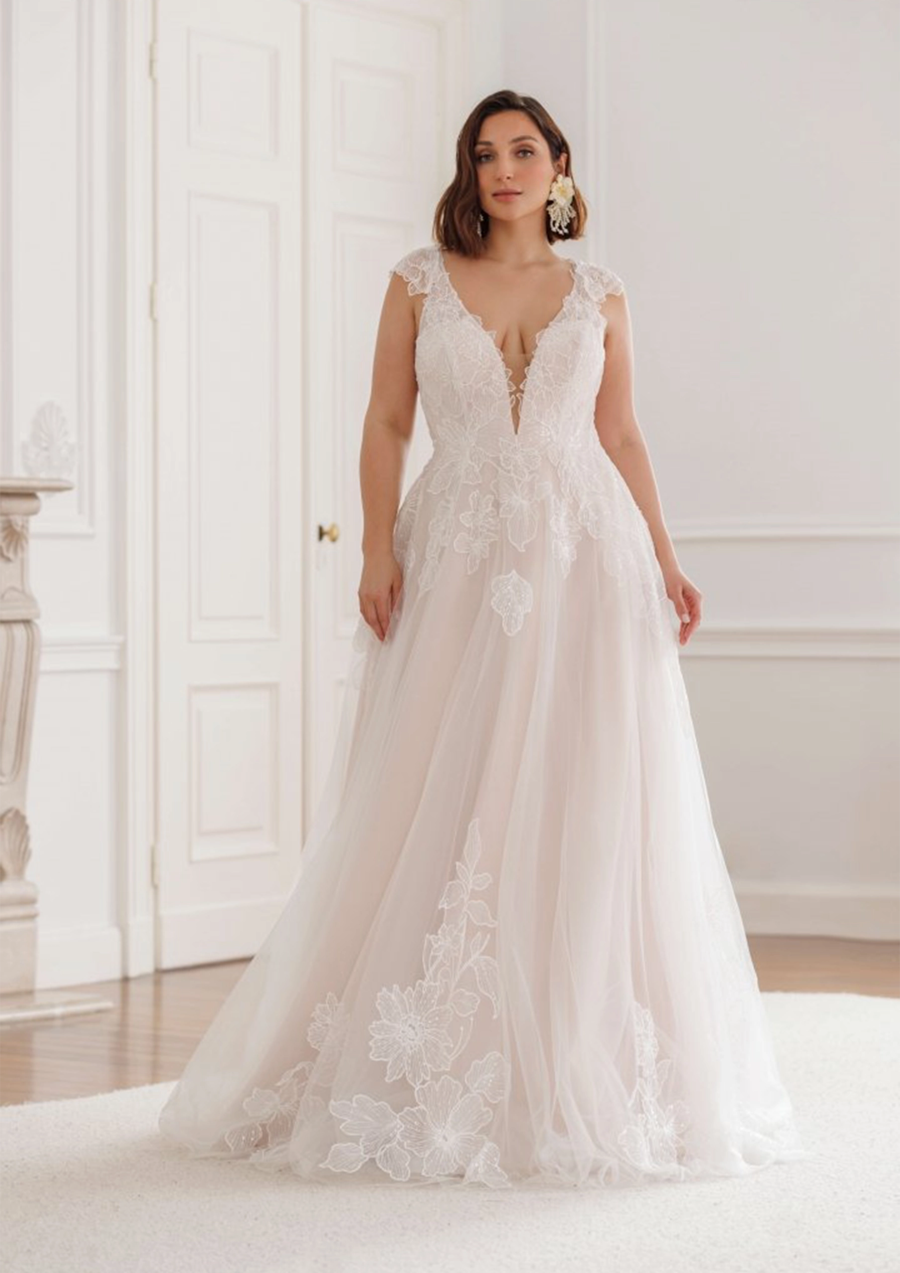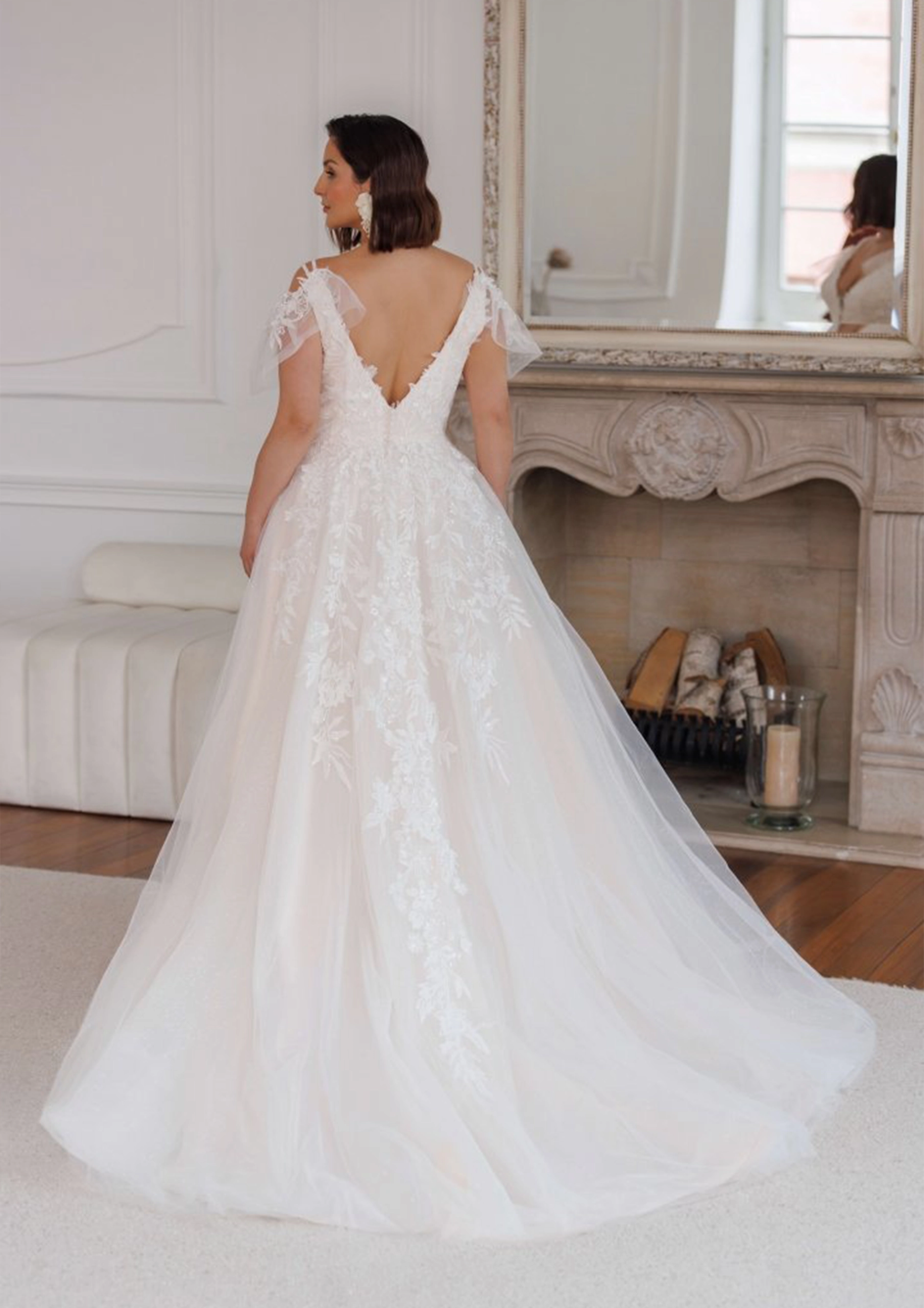 Une robe ligne A avec un décolleté en V devant et derrière, avec un emboitant parfait, dentelle à motifs floraux » alliant grâce et modernité, idéale pour les mariées grande taille.