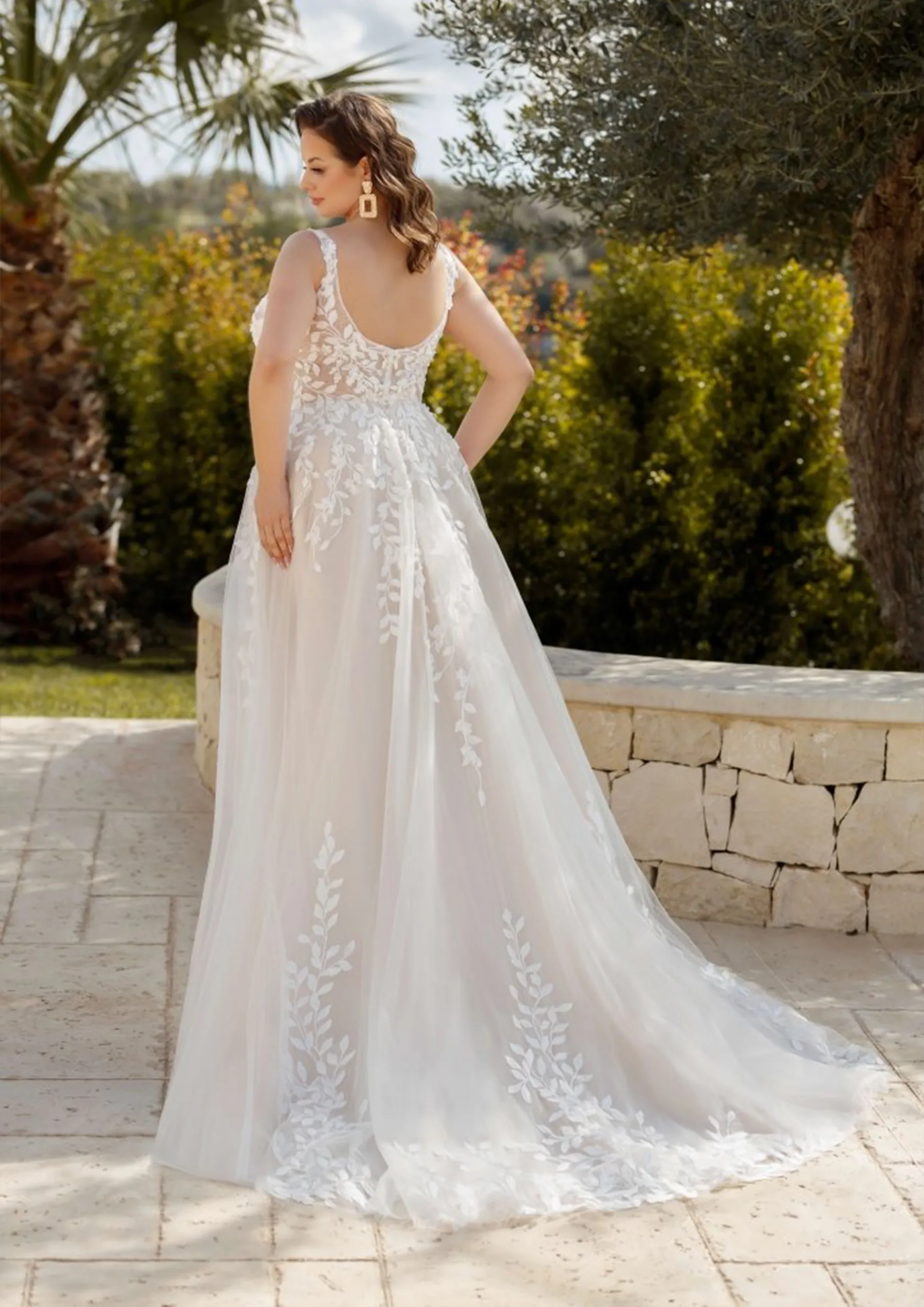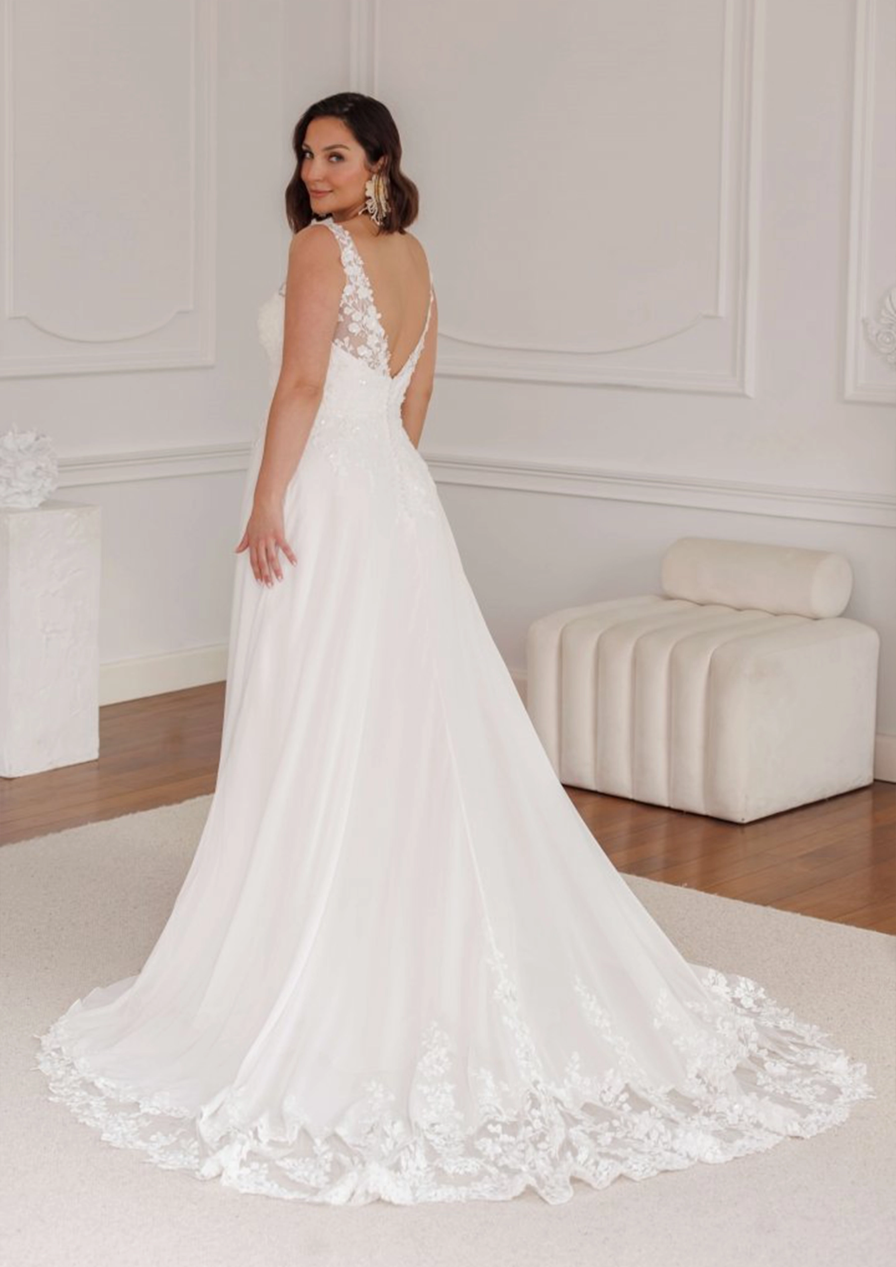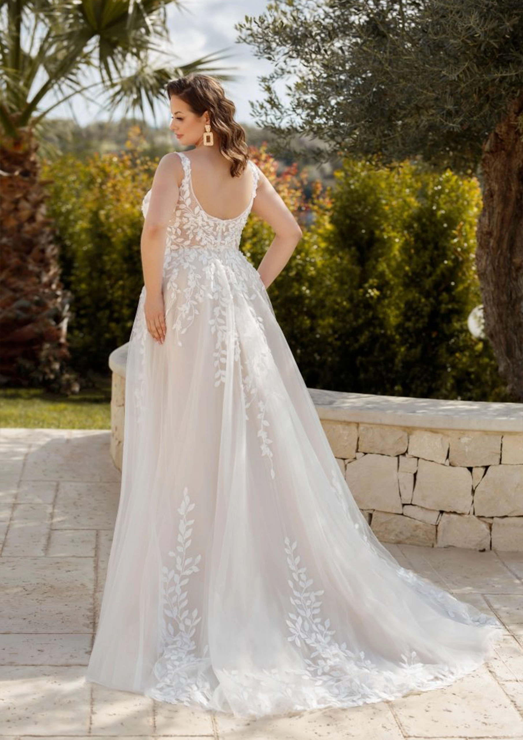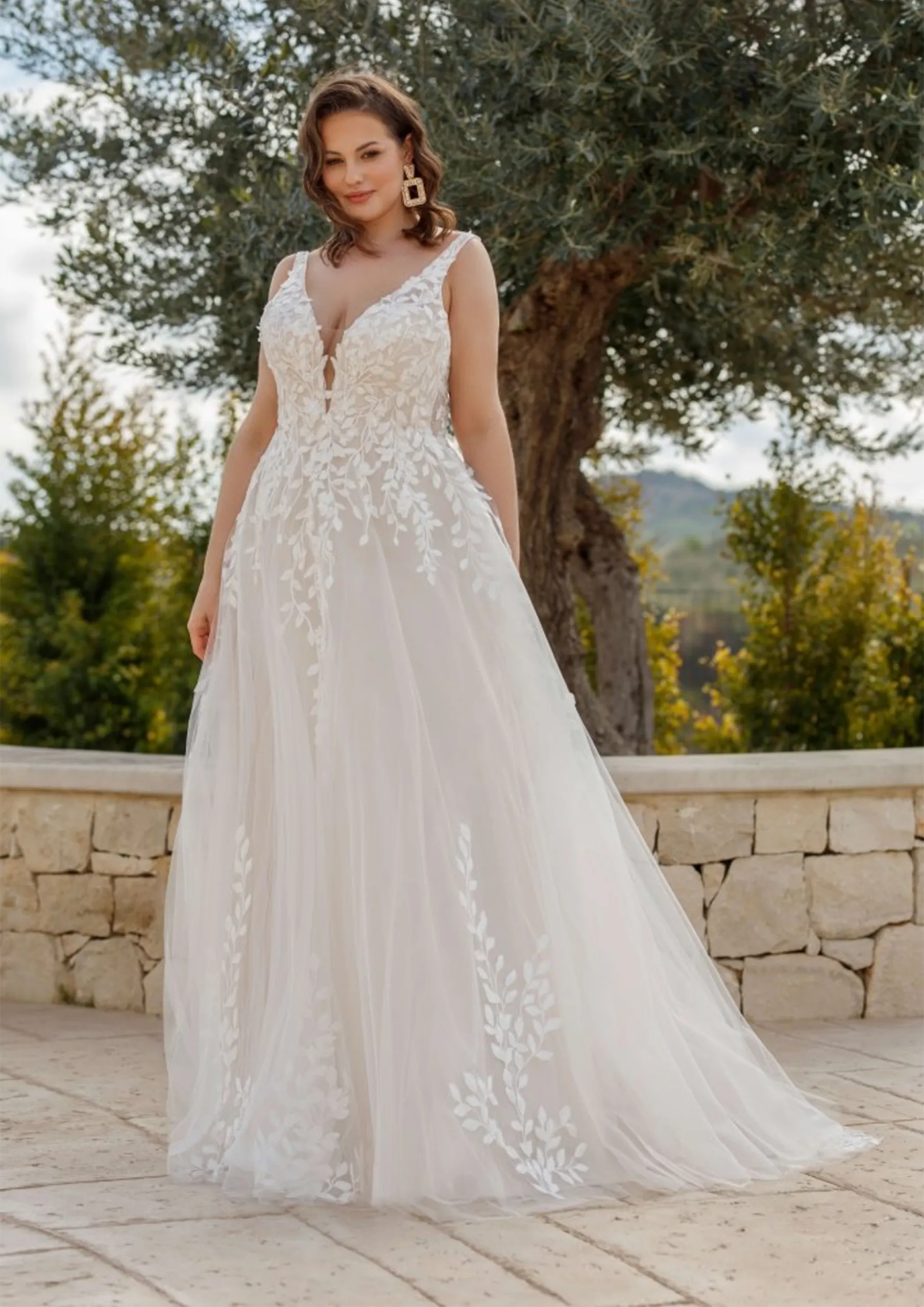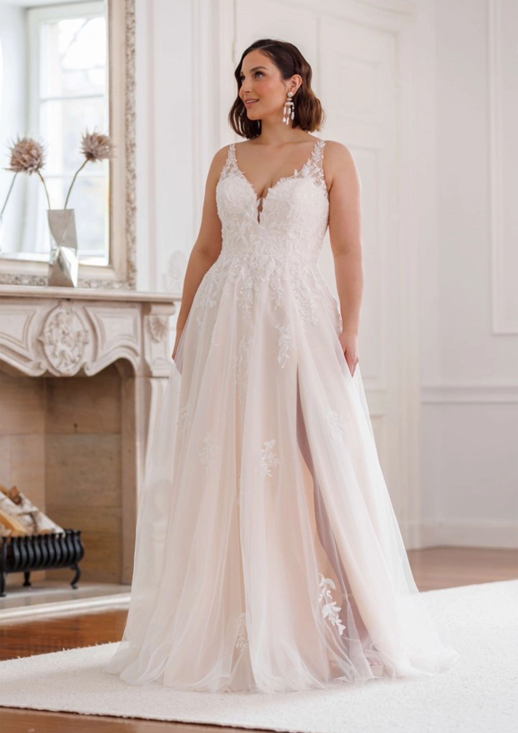 Une robe ligne A avec un décolleté en V devant et derrière, avec un emboitant parfait, dentelle à motifs floraux » alliant grâce et modernité, idéale pour les mariées grande taille.