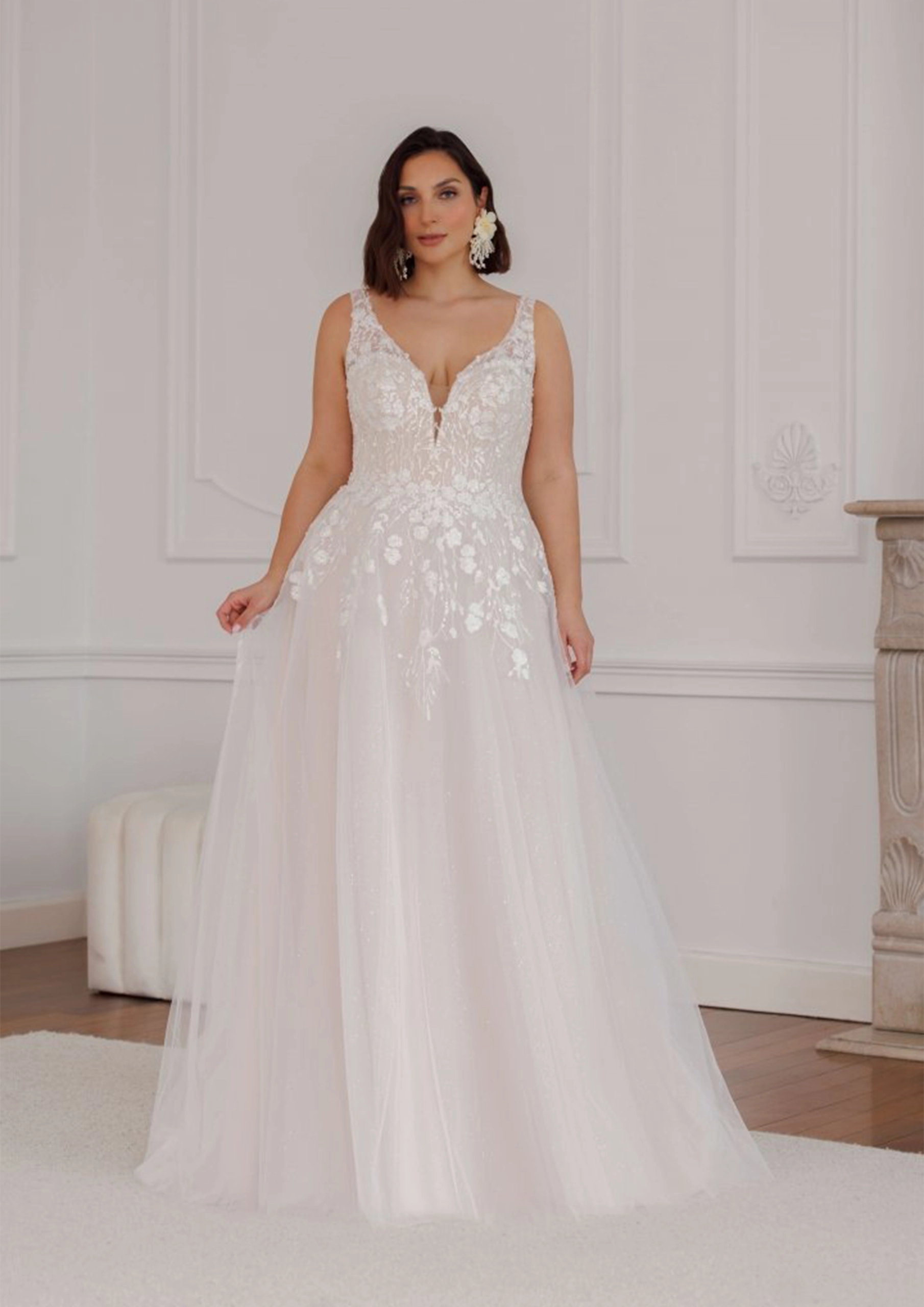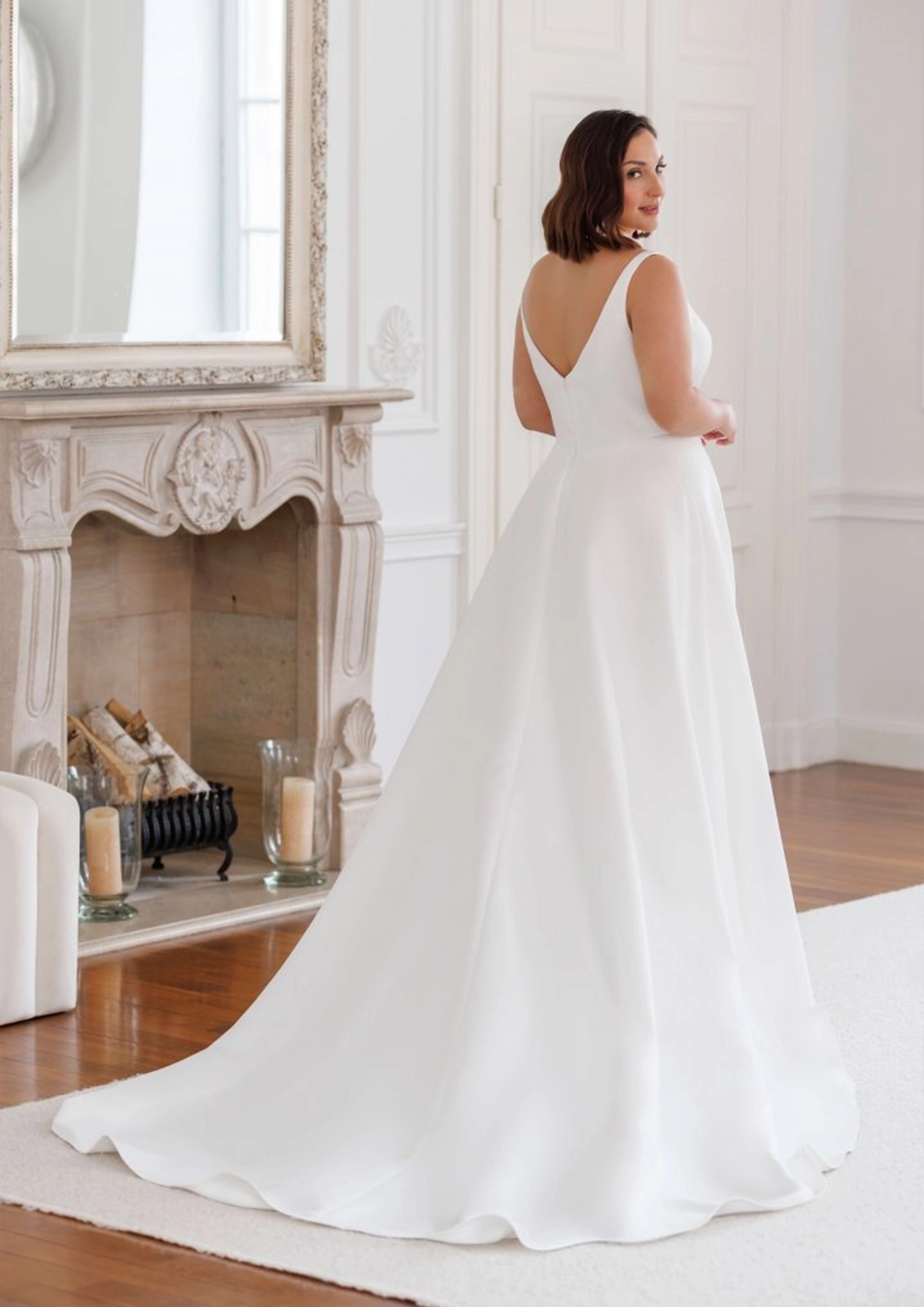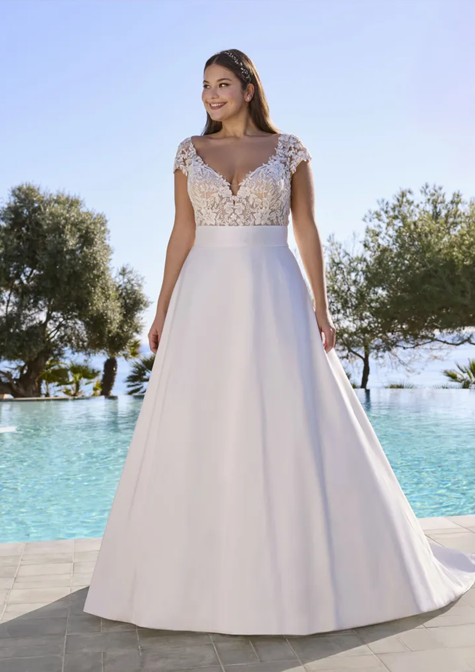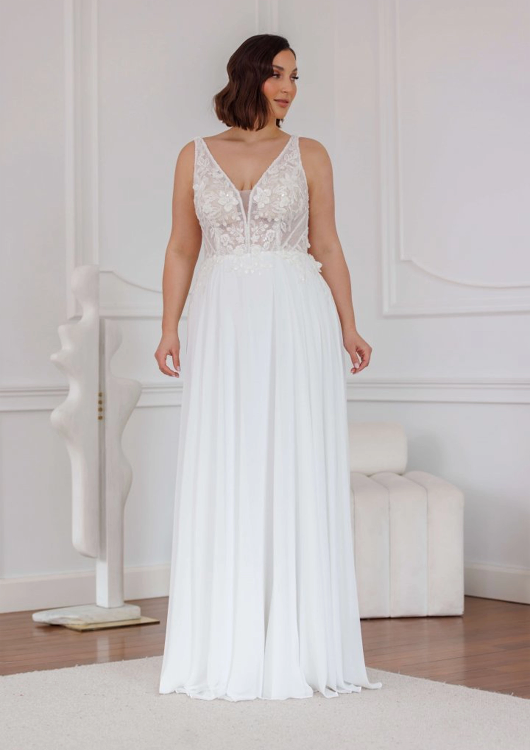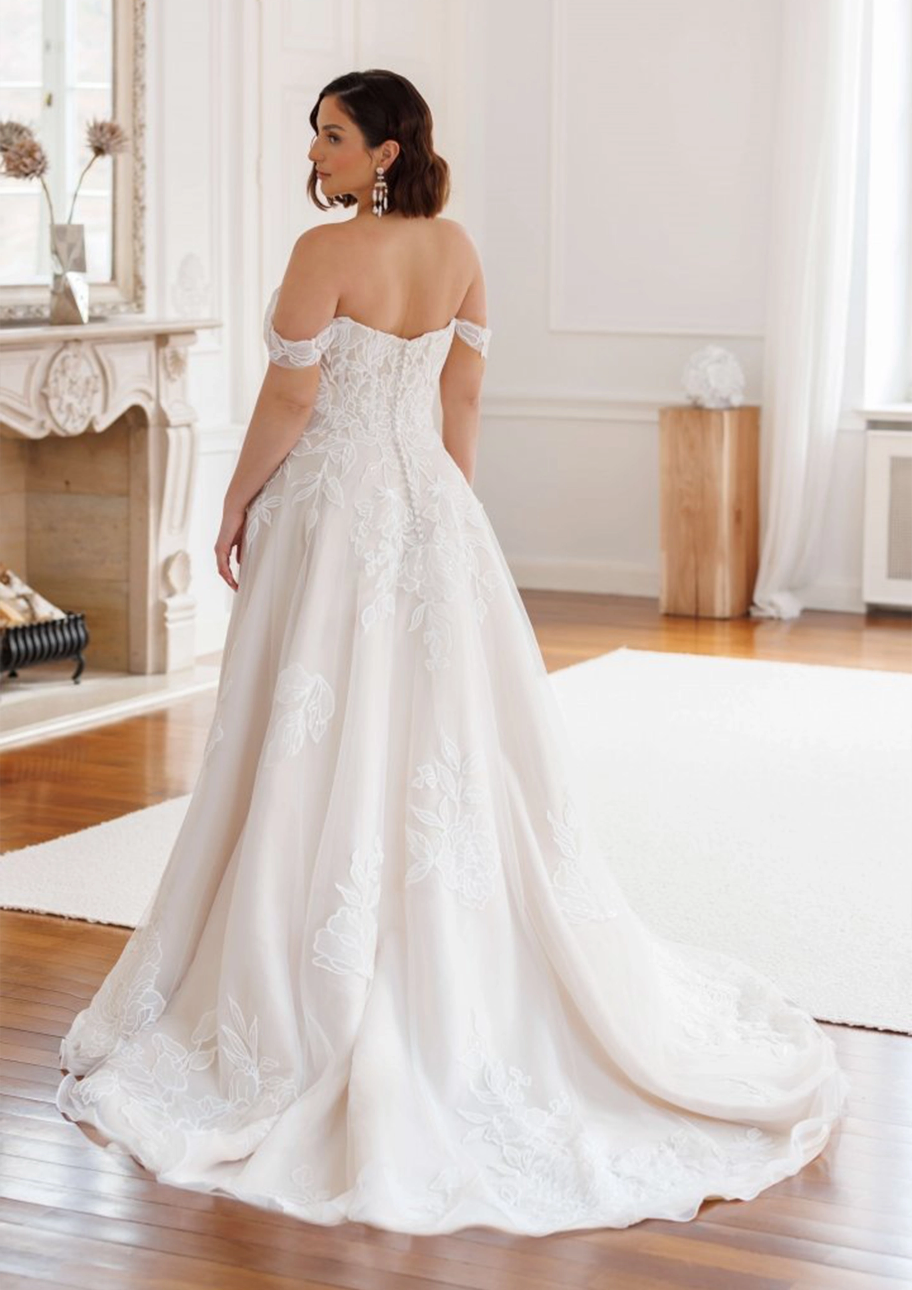 Une robe ligne A avec un décolleté en V devant et derrière, avec un emboitant parfait, dentelle à motifs floraux » alliant grâce et modernité, idéale pour les mariées grande taille.