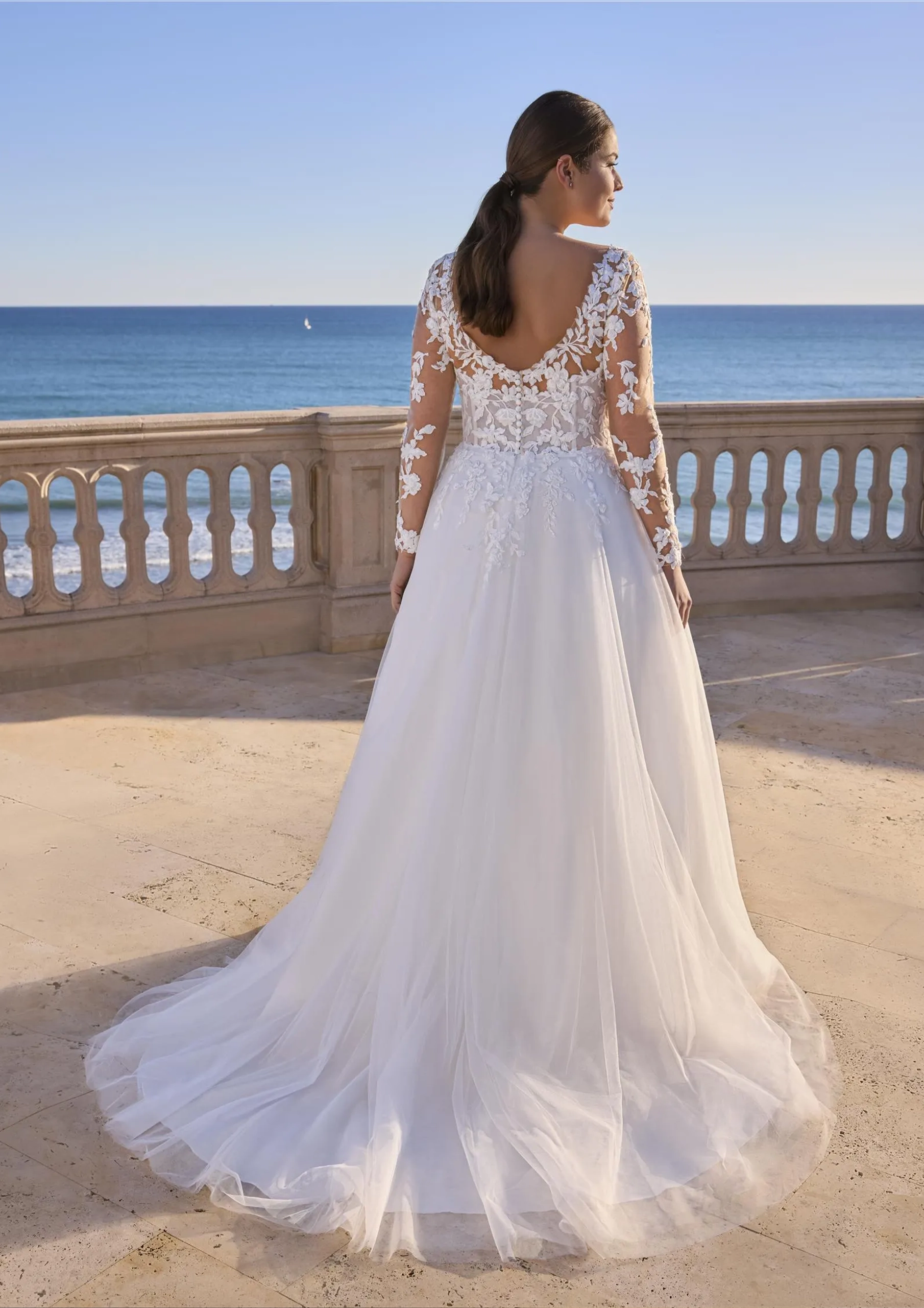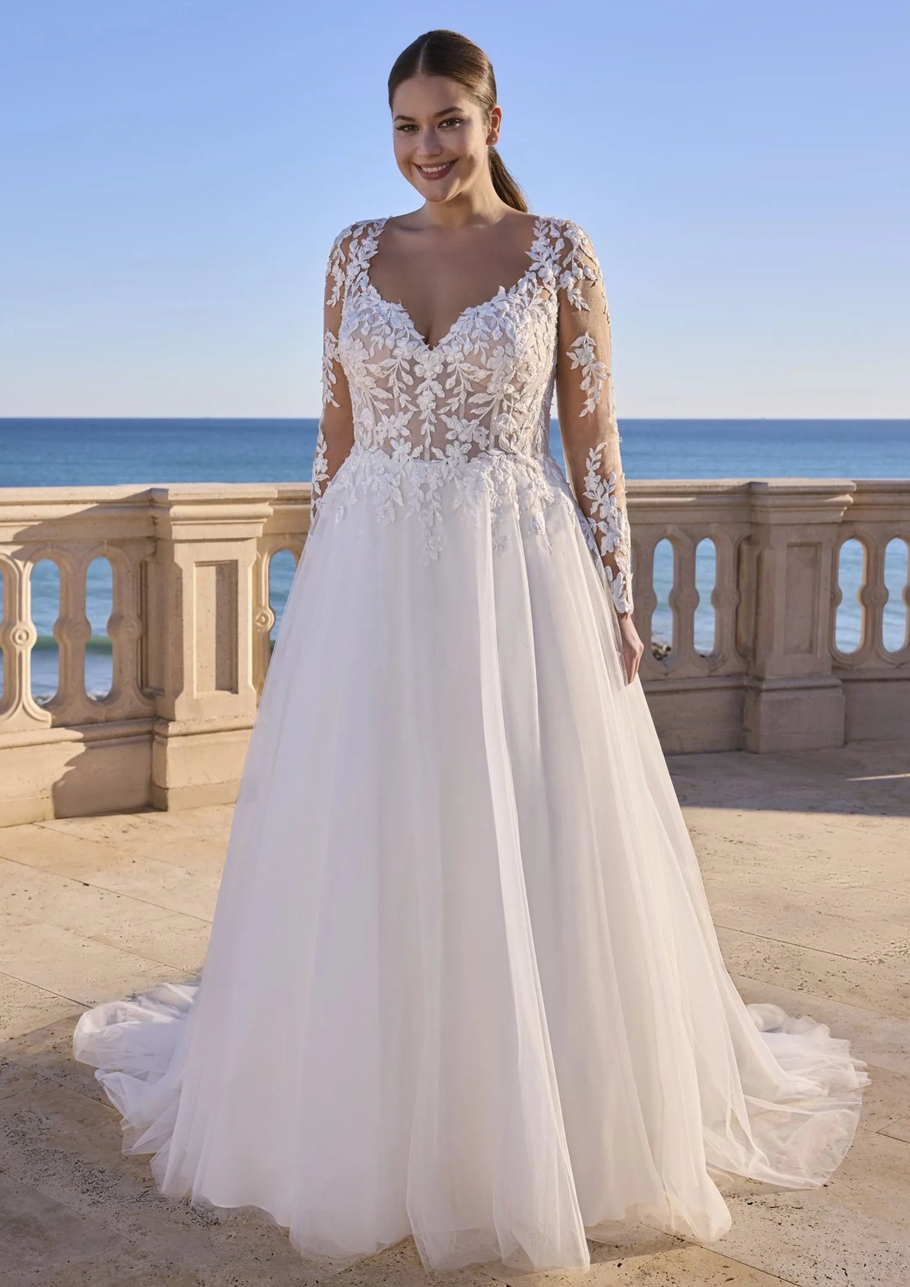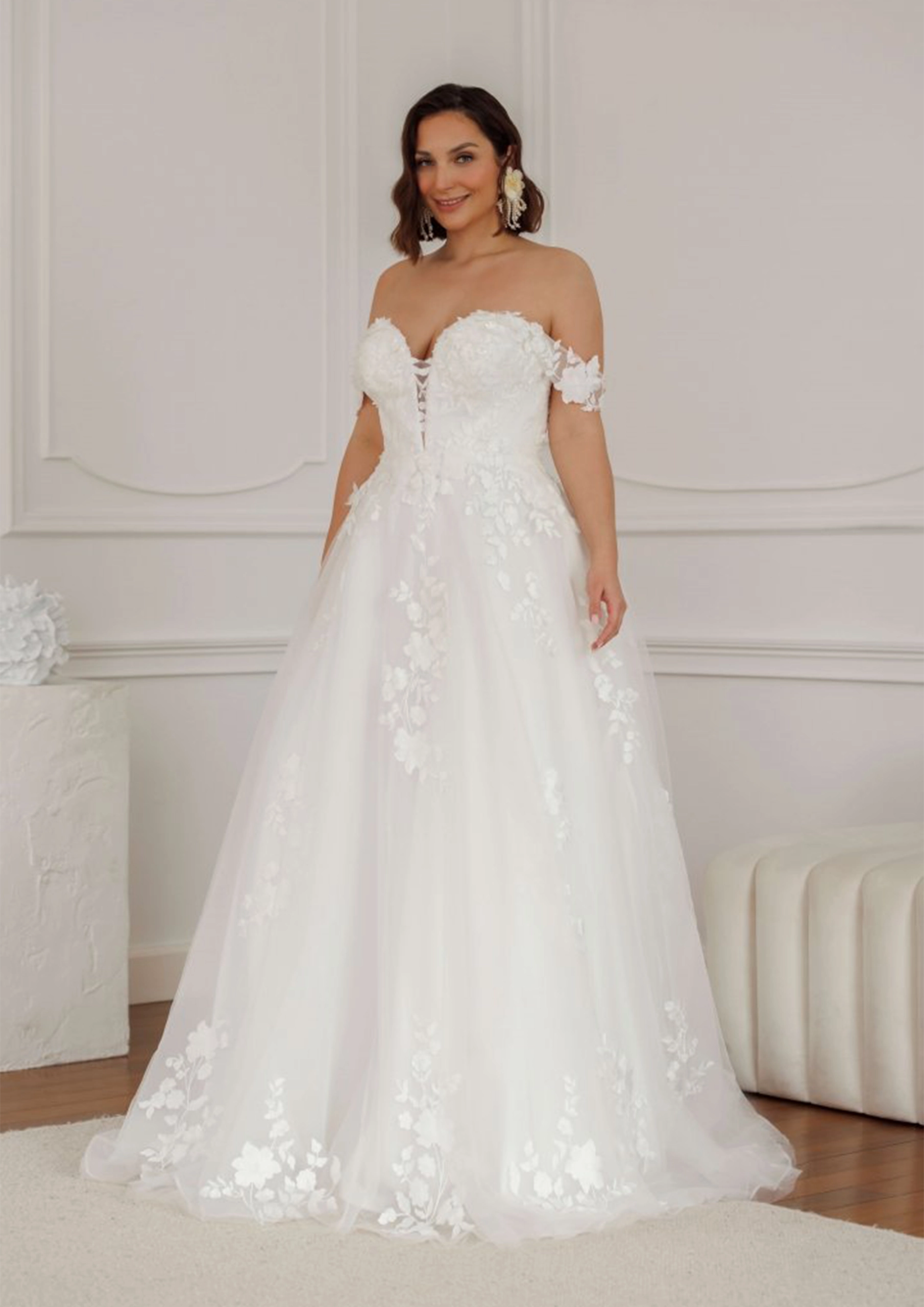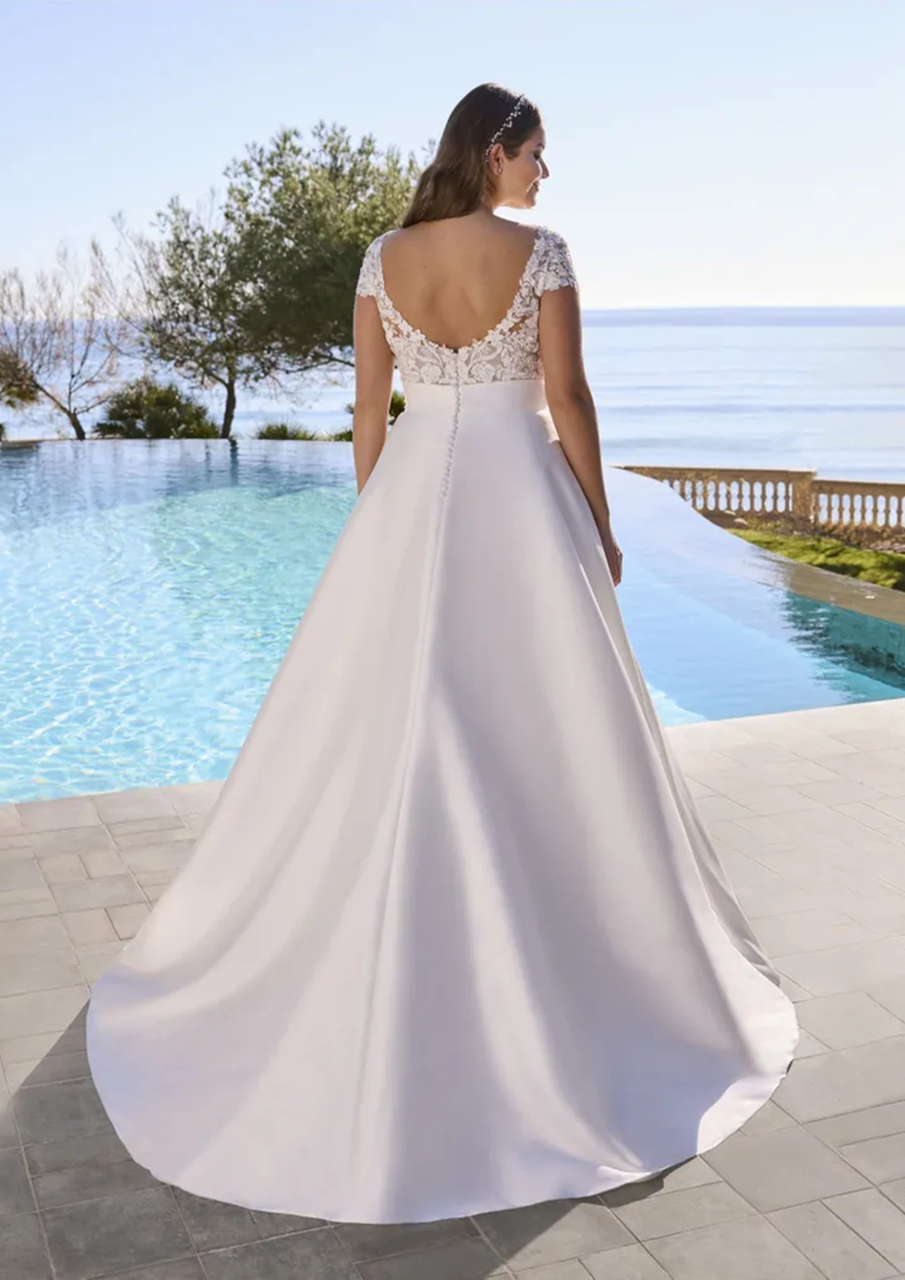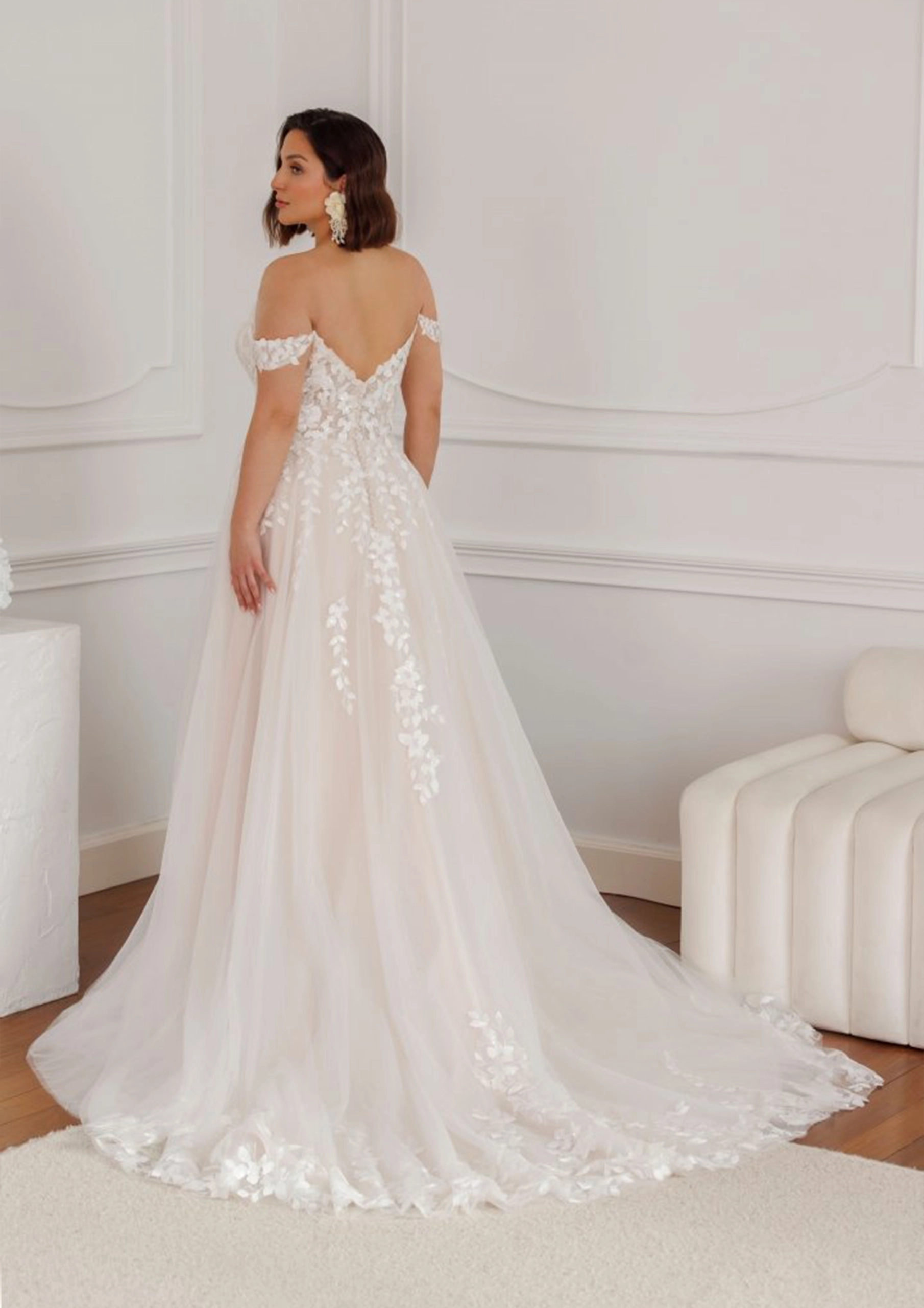 Une robe ligne A avec un décolleté en V devant et derrière, avec un emboitant parfait, dentelle à motifs floraux » alliant grâce et modernité, idéale pour les mariées grande taille.