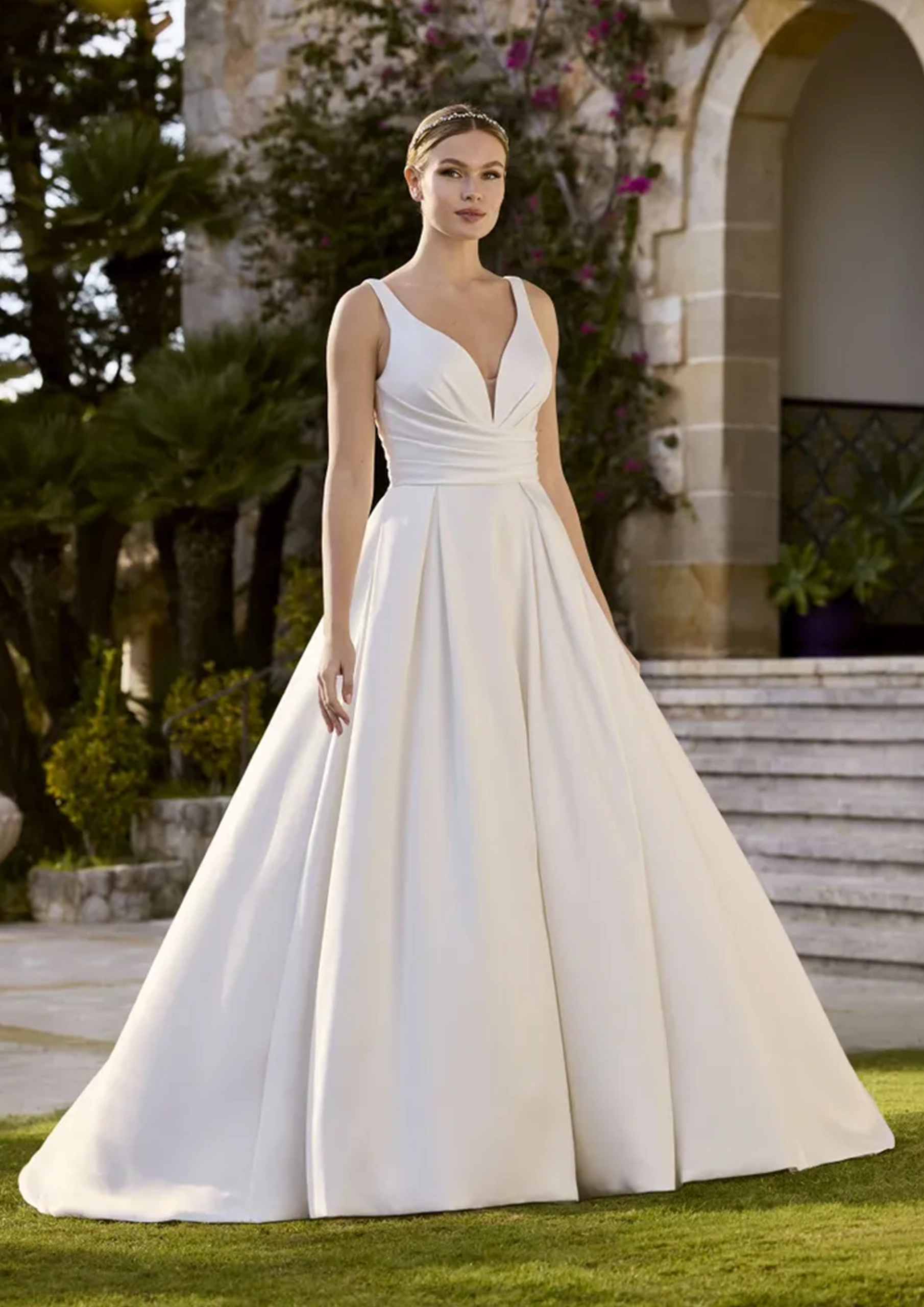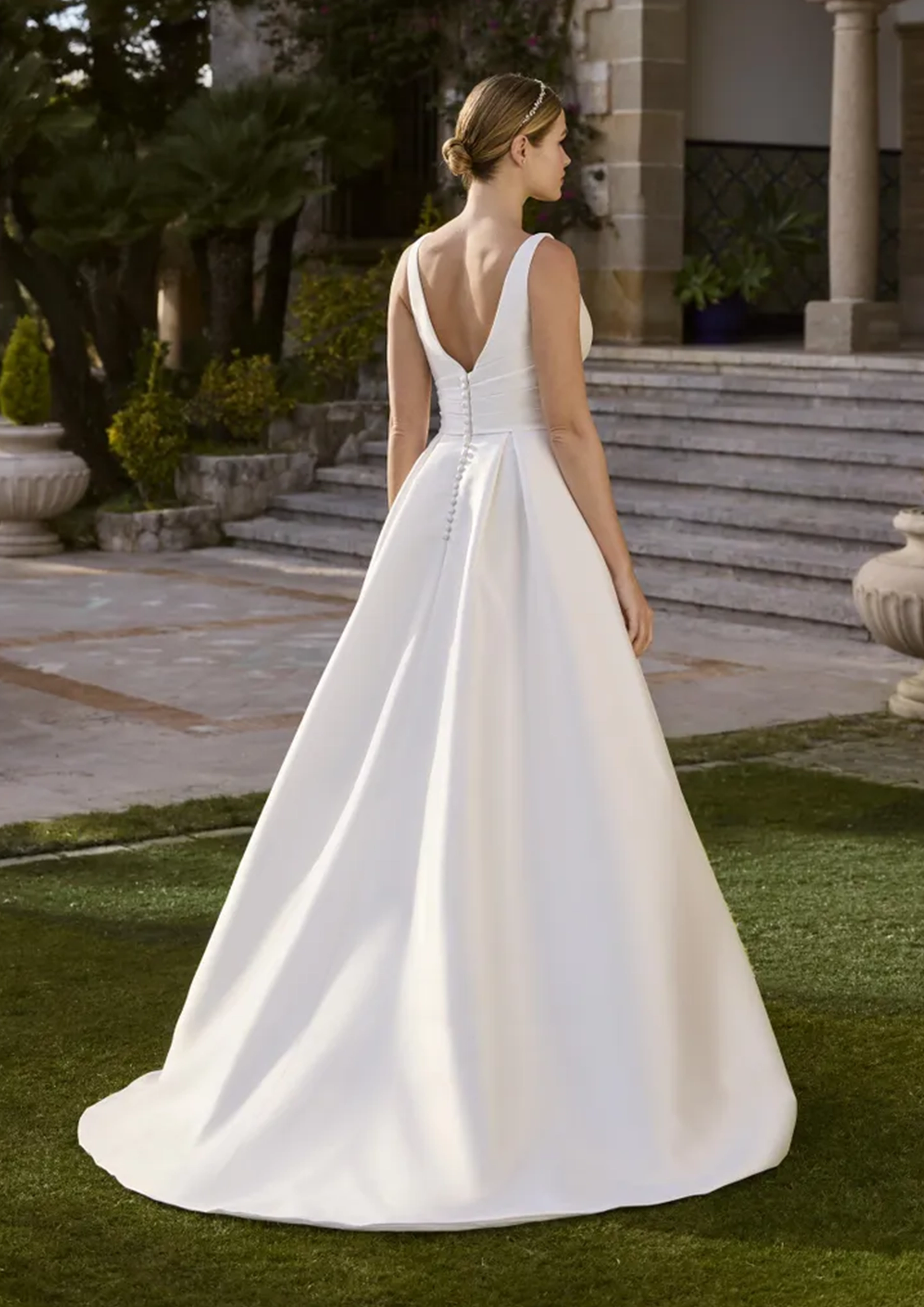 Robe de mariée trapèze fluide avec décolleté en V et bretelles.