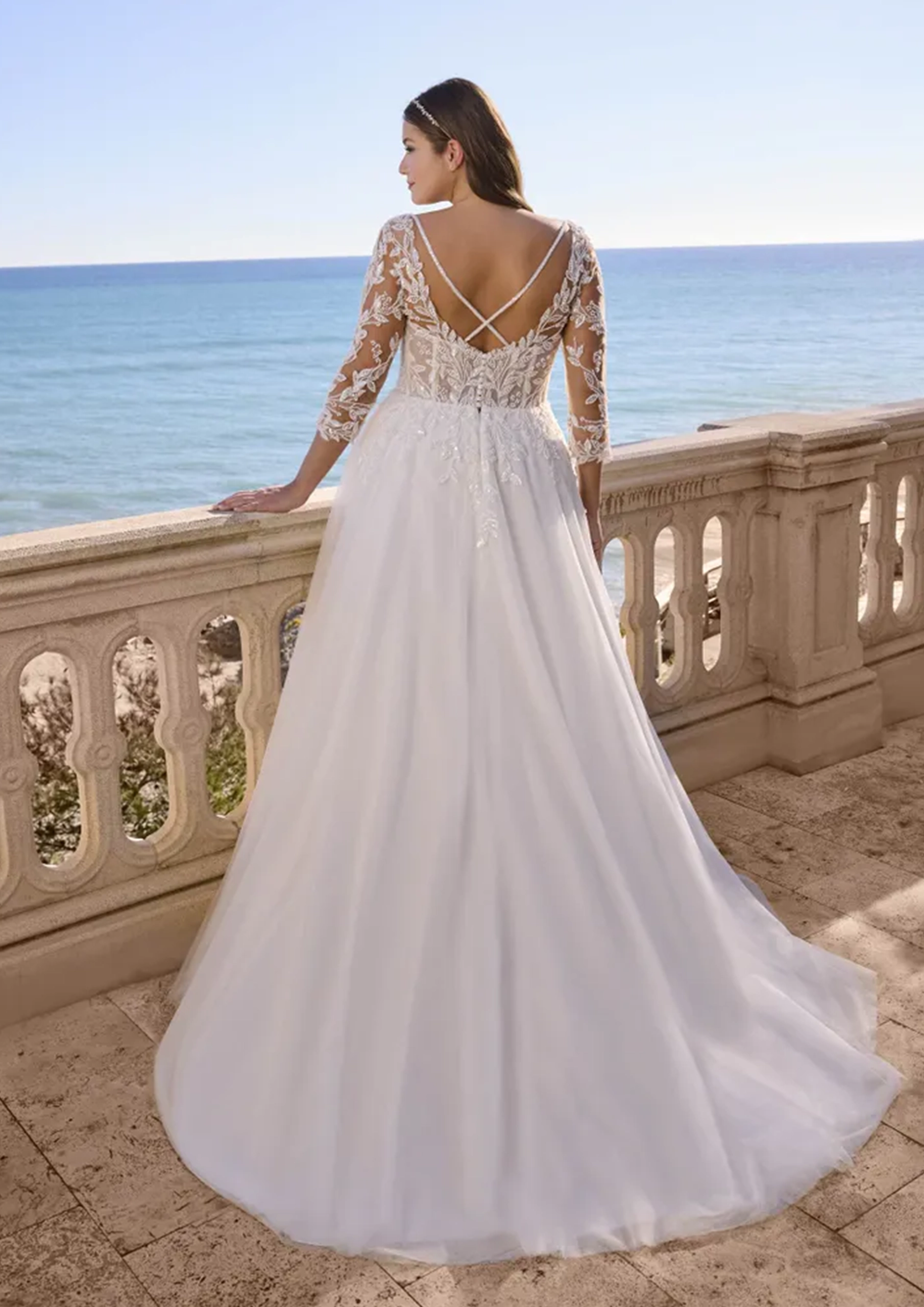 Une robe ligne A avec un décolleté en V devant et derrière, dotée de manches trois-quarts et ornée de paillettes, dentelle et perles — alliant grâce et modernité, idéale pour les mariées grande taille.