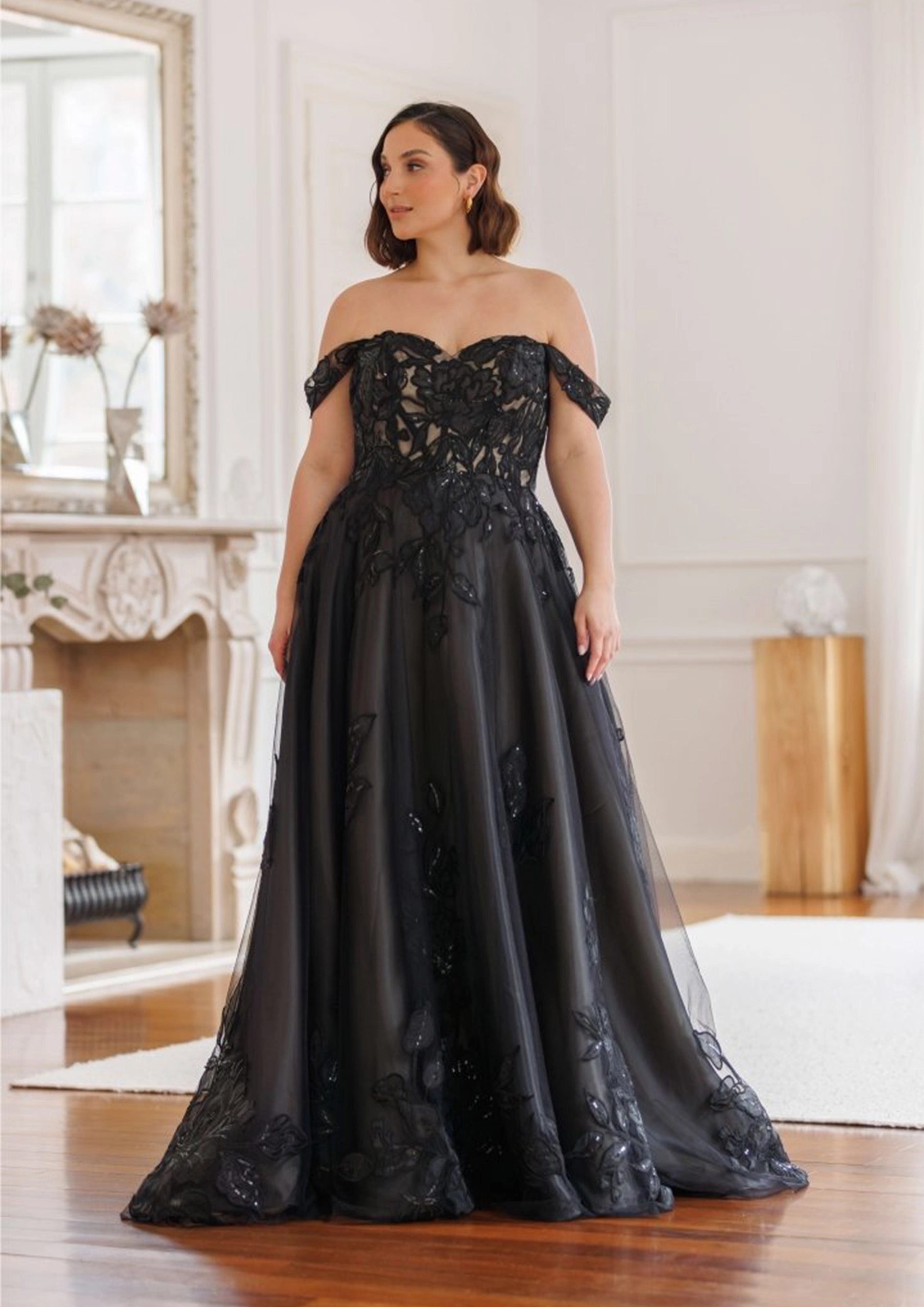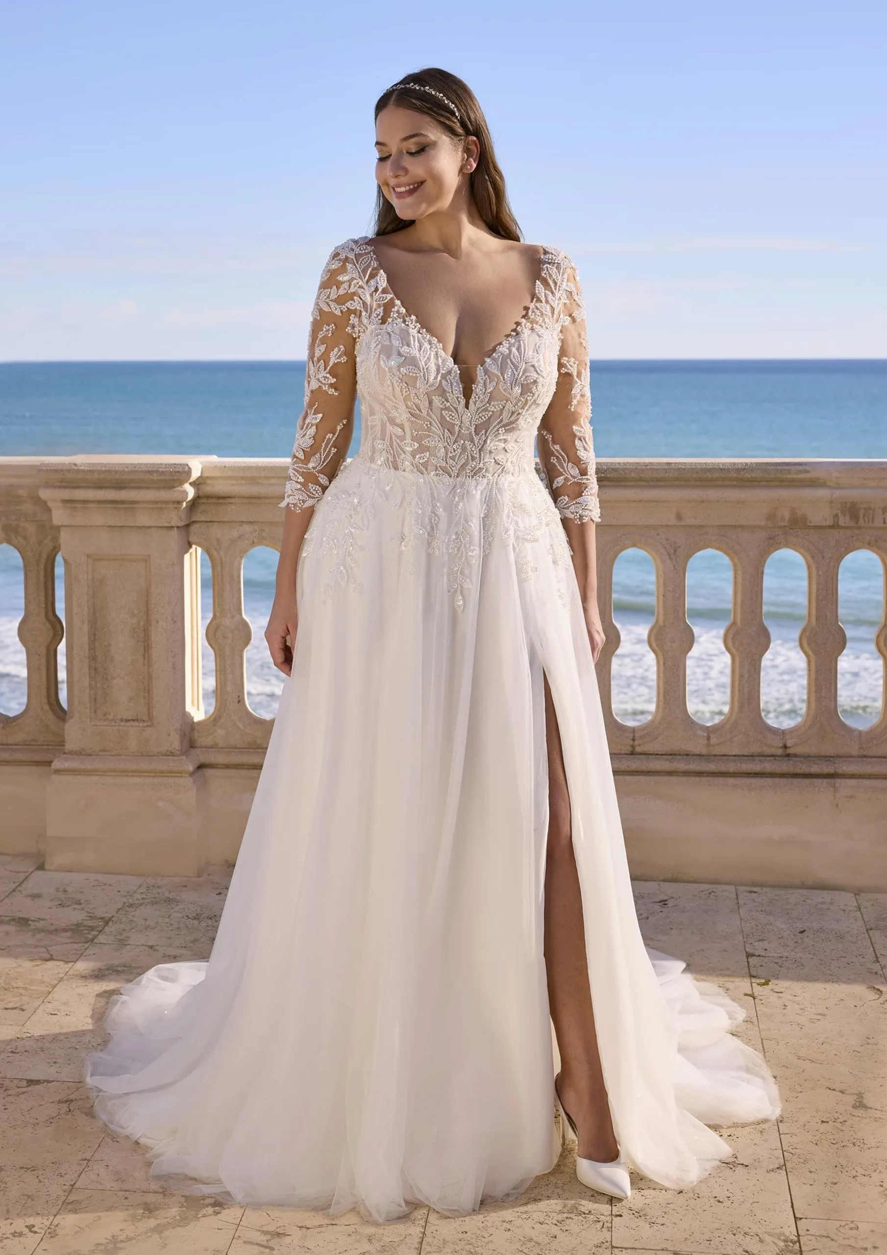 Volumineuse et gracieuse, cette robe princesse en tulle avec un décolleté en cœur et des manches longues apporte une touche royale, ornée de scintillements et de détails raffinés pour les mariées grande taille.