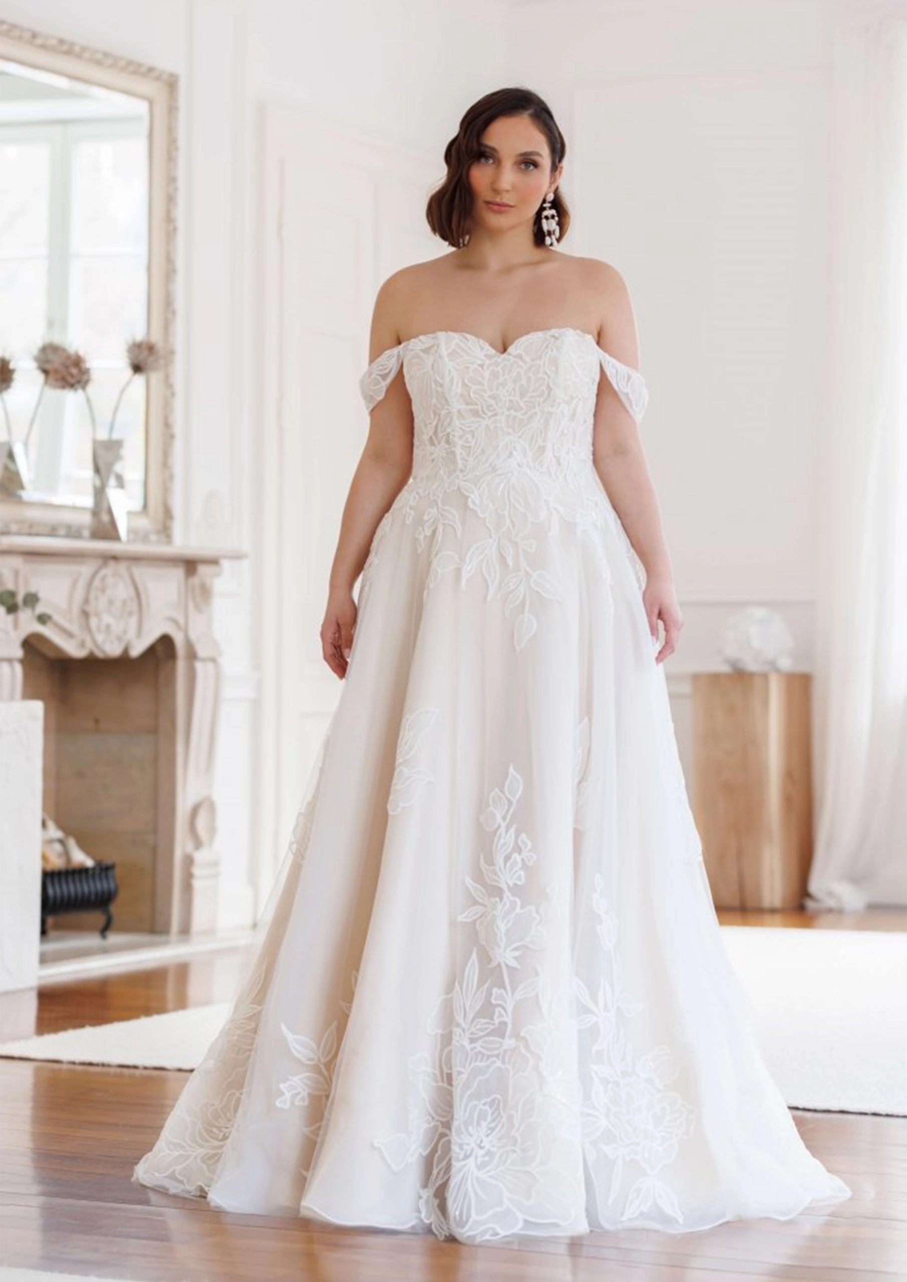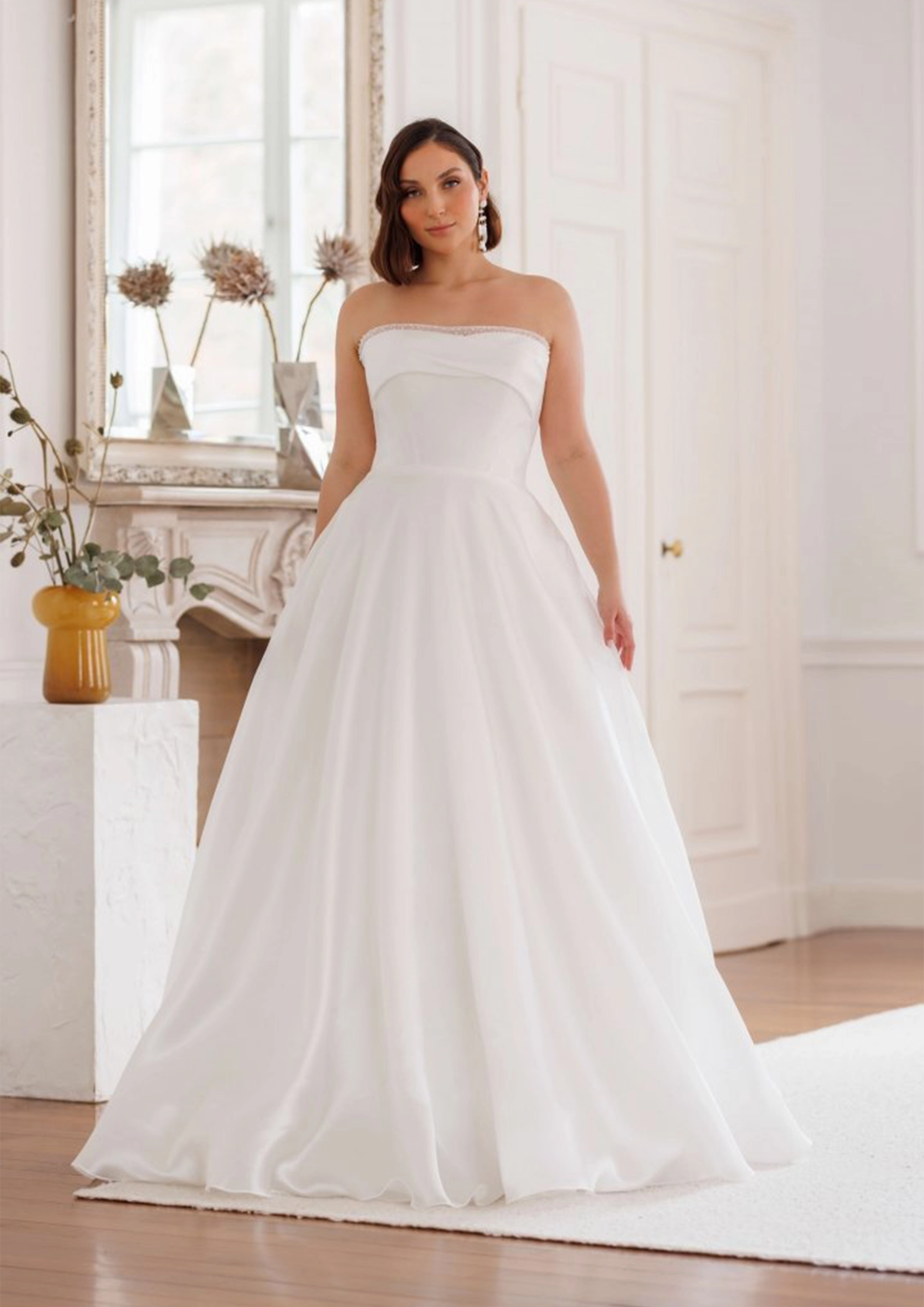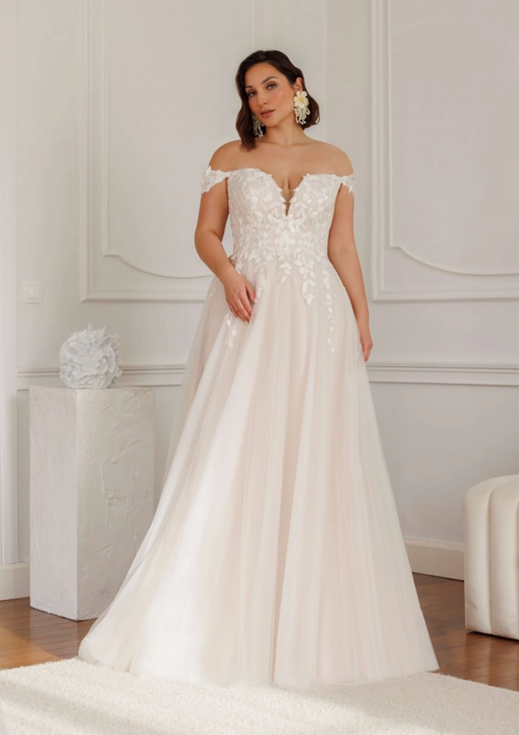 Robe de mariée grande taille réalisée en dentelle et tulle.