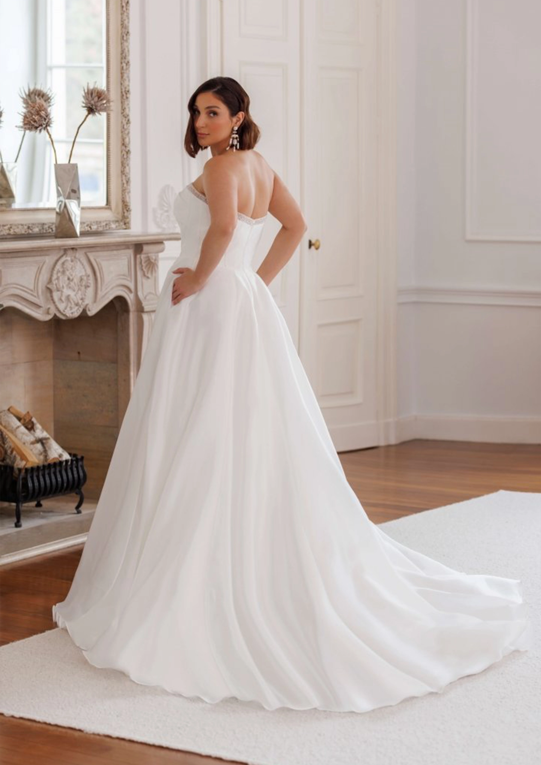 Robe de mariée de style princesse, bustier à découpe cœur minimaliste réalisée en crêpe et mousseline.
