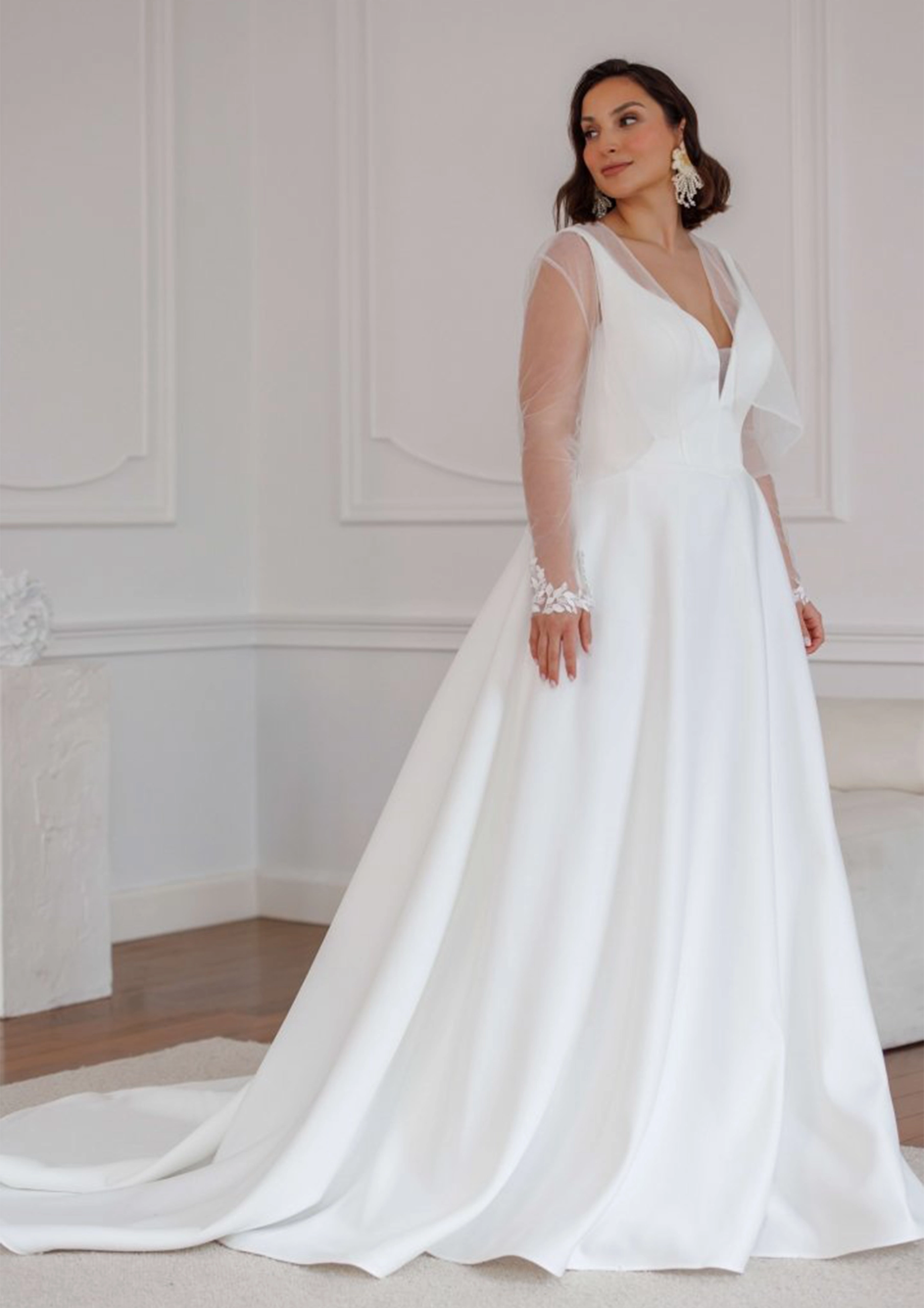 Robe de mariée coupe princesse avec décolleté en coeur avec manches longues en tulle