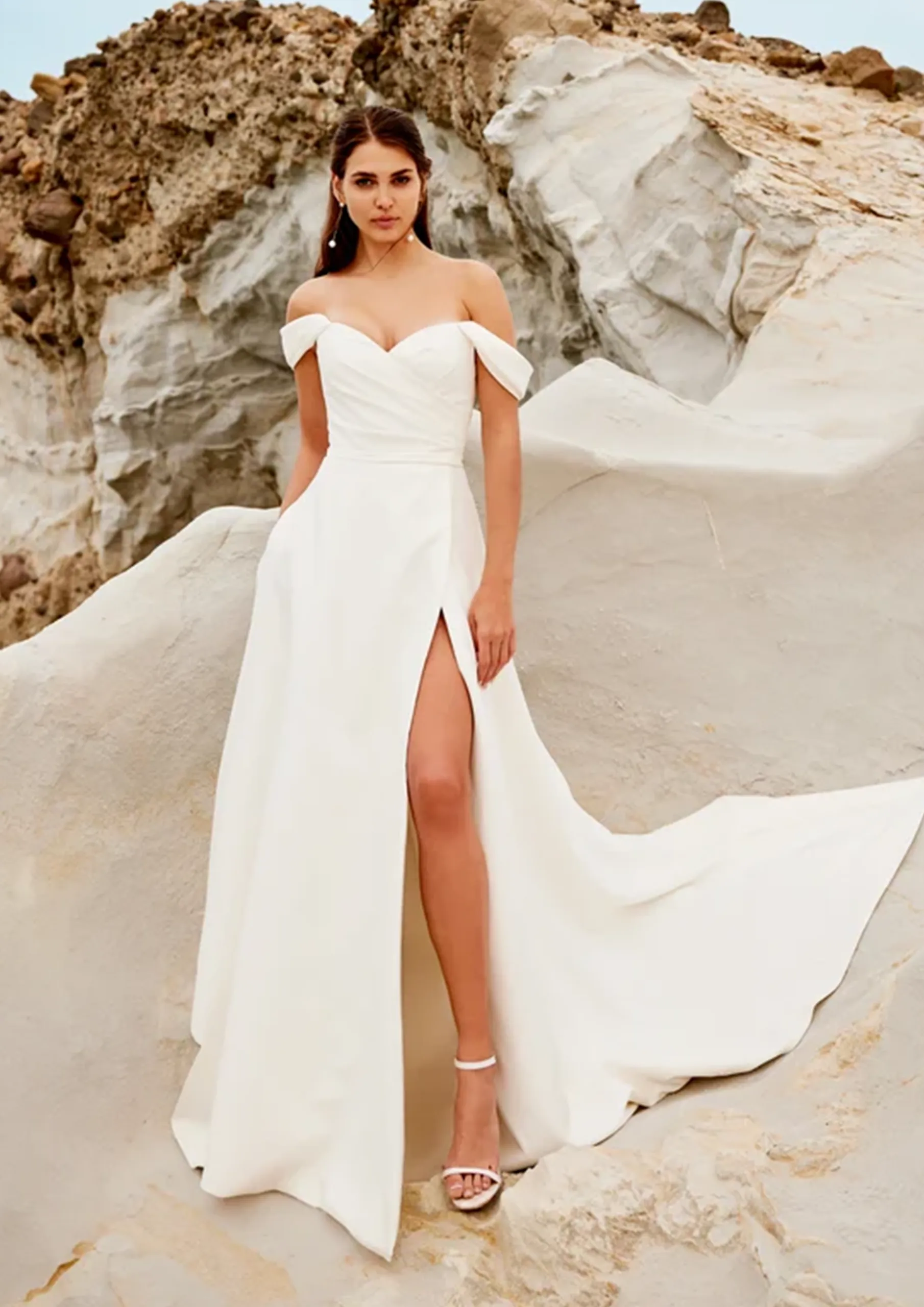 Robe de mariée de style minimaliste réalisé en crêpe avec corsage drapé soulignant magnifiquement la taille. Délicates manches tombantes aux épaules façon «décolleté bateau».