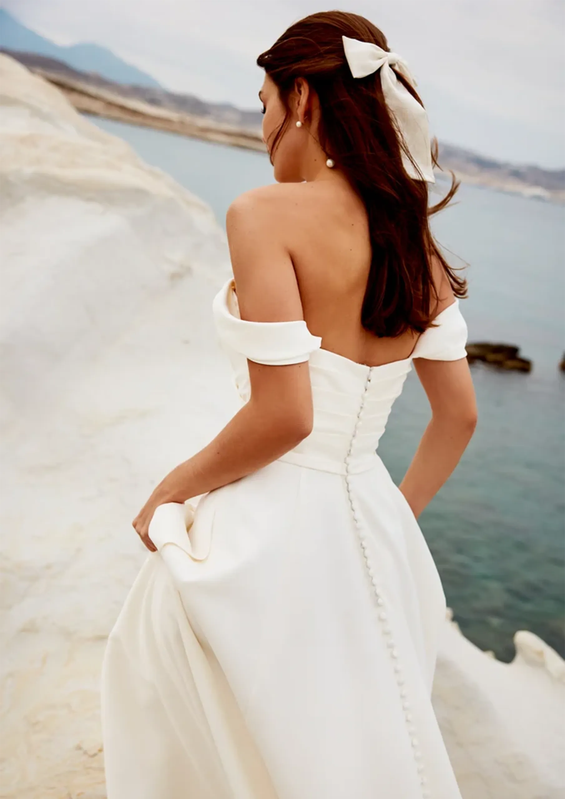 Robe de mariée en mousseline de soie avec corsage plissé et dos nu, ligne trapèze avec épaules dégagées, manches drapées en mousseline fluide.