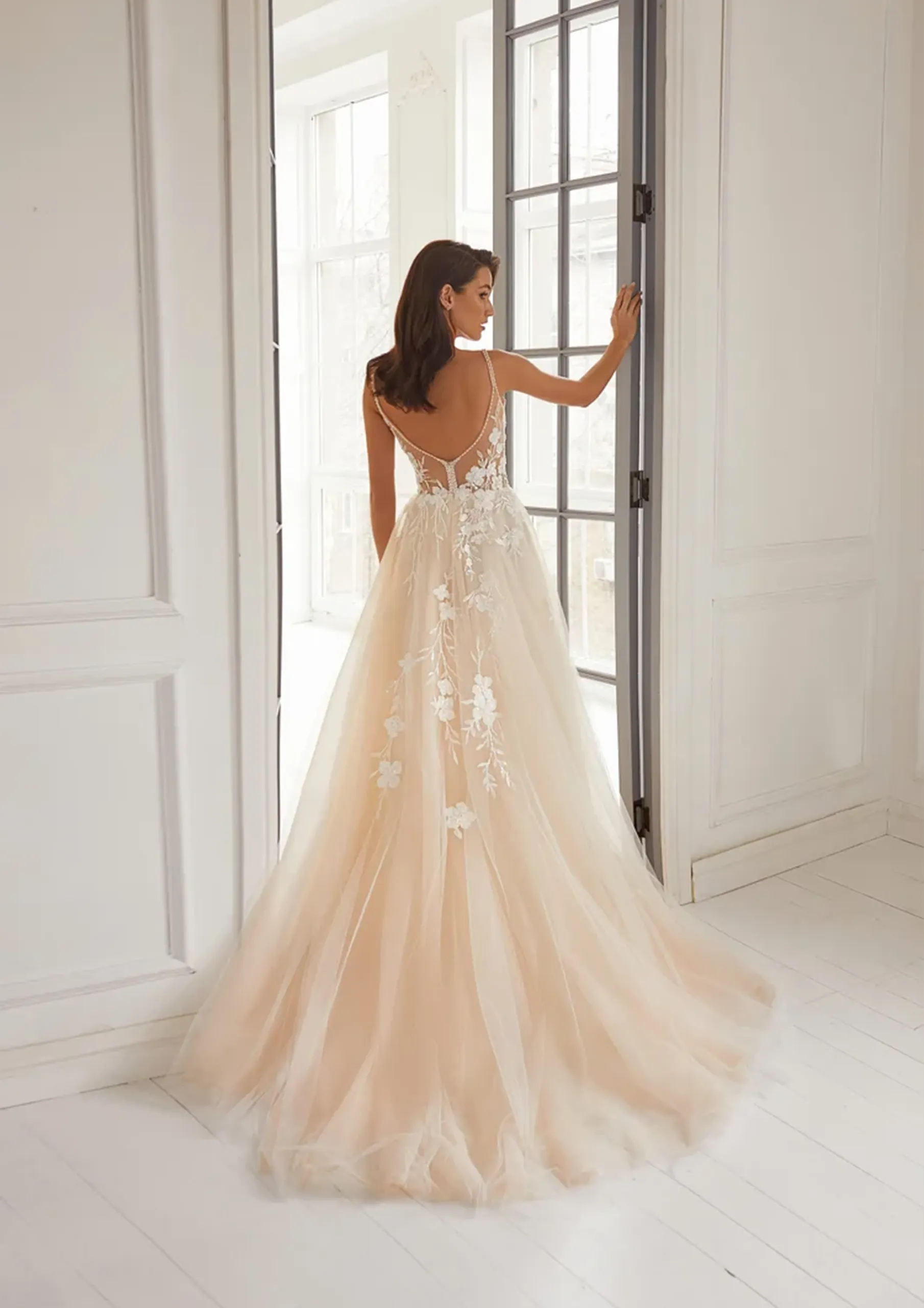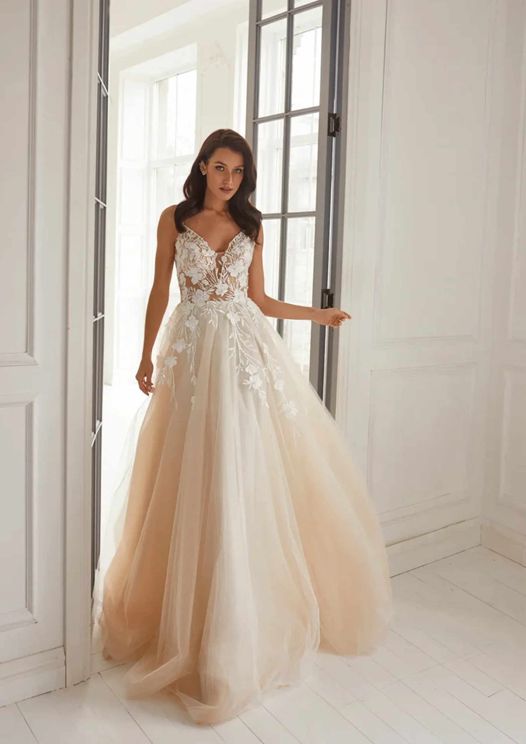 Robe décolleté V en tulle rebrodé d’appliques de dentelles avec éclats de cristaux, jupe en tulle souple de forme A.