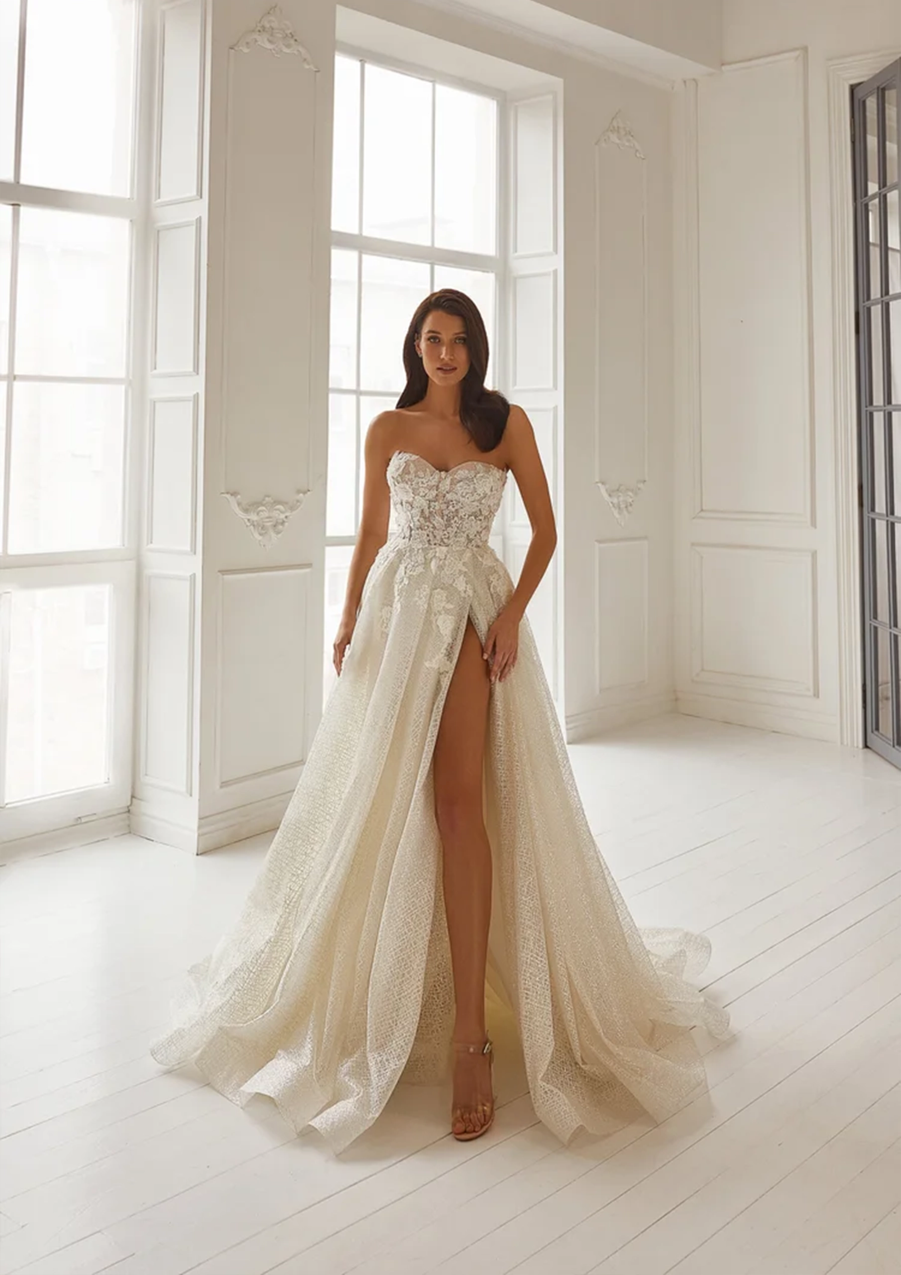 Robe de mariée bustier forme droite avec élégante découpe glamour, jupe A line princesse avec traine chapelle.