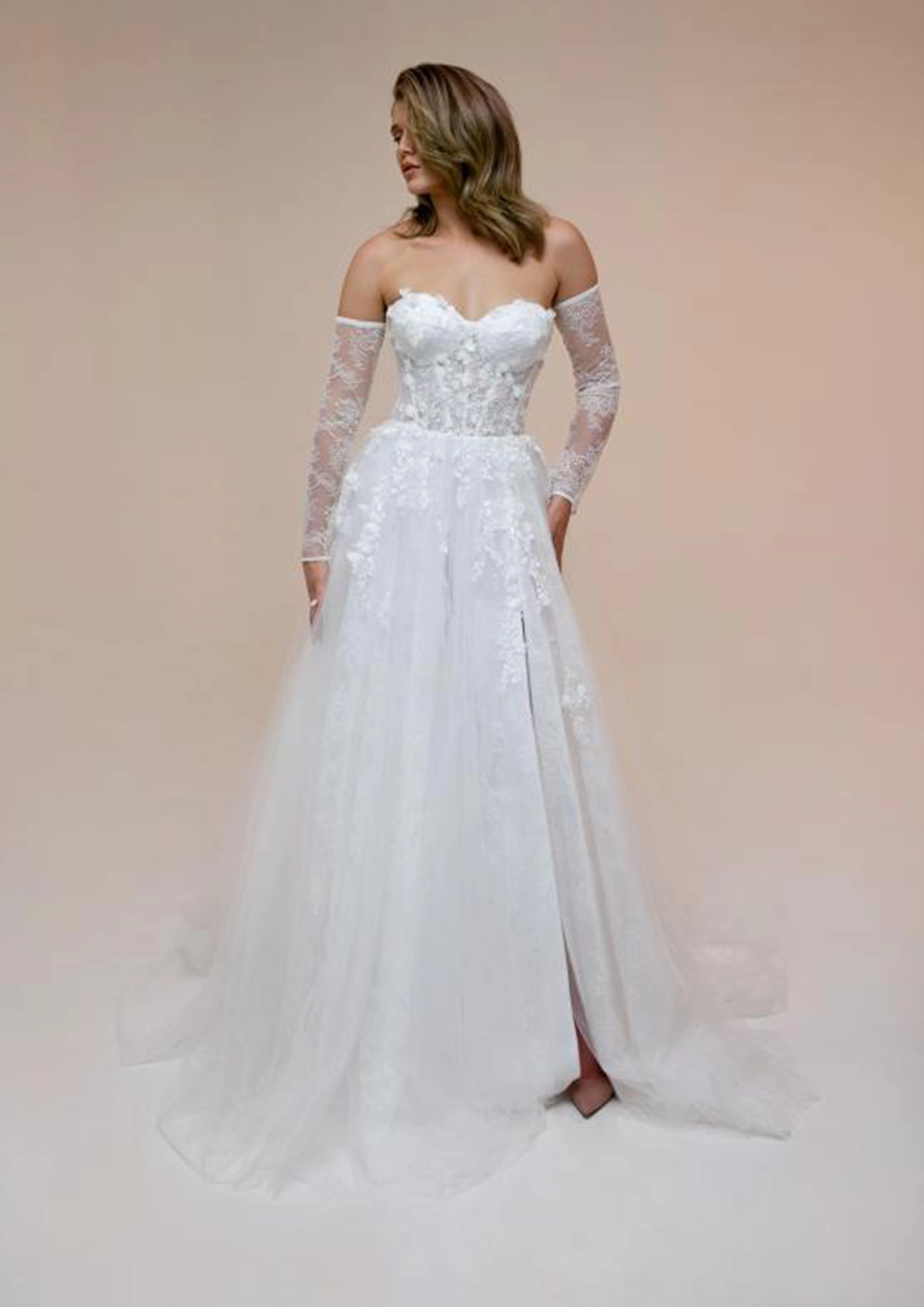 Robe de mariée présentée avec un bustier façon corset décolleté cœur, également disponible en version corset décolleté droit.