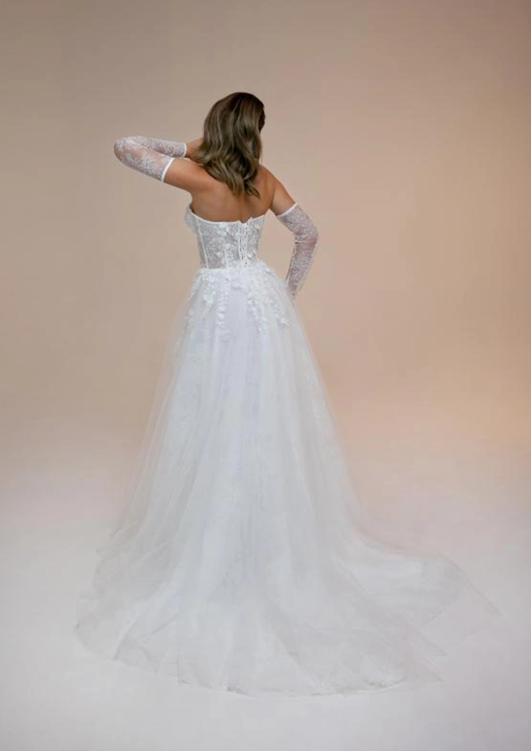 Robe de mariée réalisée en tulle pailleté et tulle exclusif à motifs 3D.